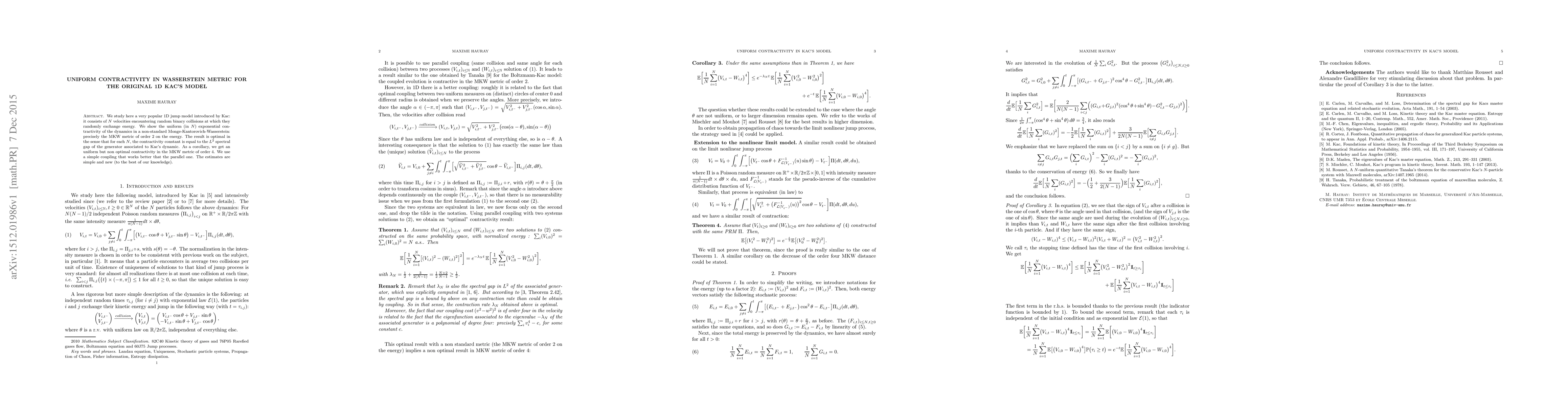 We study here a very popular 1D jump model introduced by Kac: it consists of $N$ velocities encountering random binary collisions at which they randomly exchange energy. We show the uniform (in $N$) exponential contractivity of the dynamics in a non-standard Monge-Kantorovich-Wasserstein: precisely the MKW metric of order 2 on the energy. The result is optimal in the sense that for each $N$, the contractivity constant is equal to the $L^2$ spectral gap of the generator associated to Kac's dynamic. As a corollary, we get an uniform but non optimal contractivity in the MKW metric of order $4$. We use a simple coupling that works better that the parallel one. The estimates are simple and new (to the best of our knowledge).