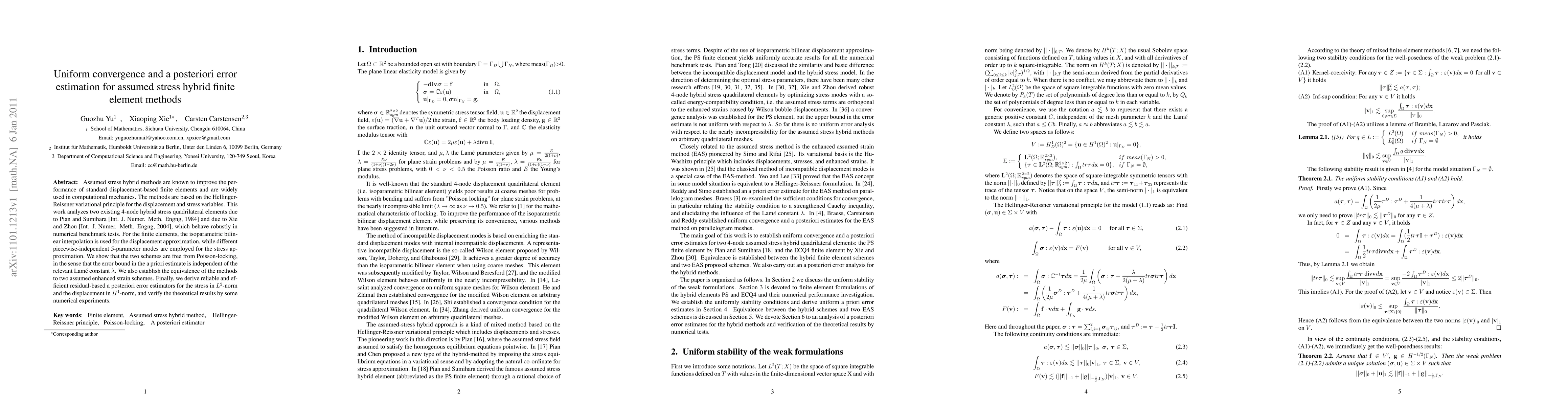 This paper investigates two assumed stress hybrid finite element methods, demonstrating their robustness and freedom from Poisson-locking. It also establishes their equivalence to assumed enhanced strain schemes and develops reliable a posteriori error estimators for stress and displacement.