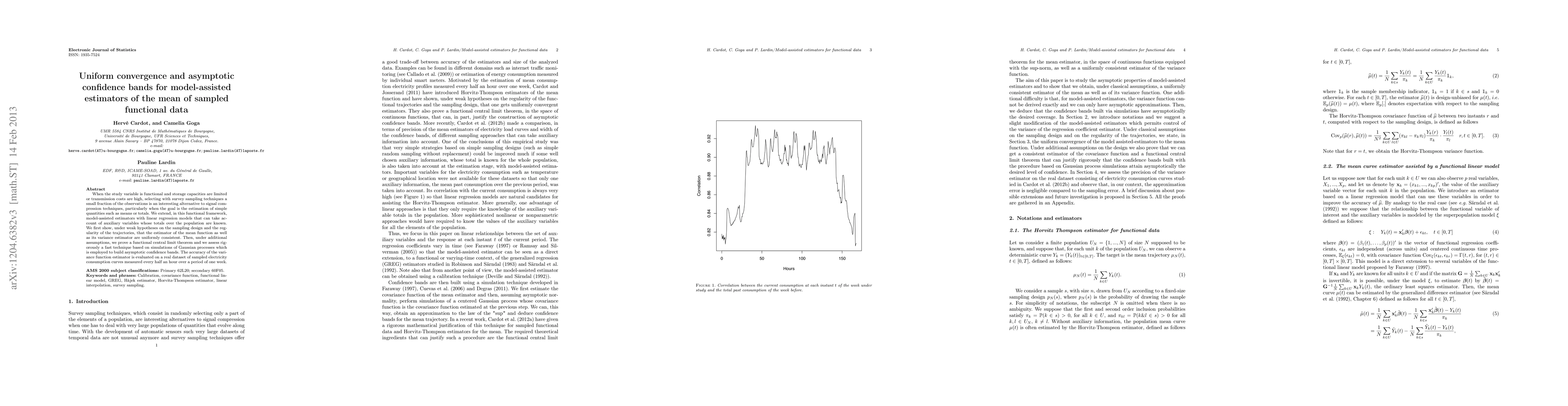 This paper explores model-assisted estimators for functional data, focusing on the mean of sampled data under limited storage or transmission constraints. It demonstrates uniform convergence and constructs asymptotic confidence bands using linear regression models and auxiliary variables, validated through a real dataset on electricity consumption.