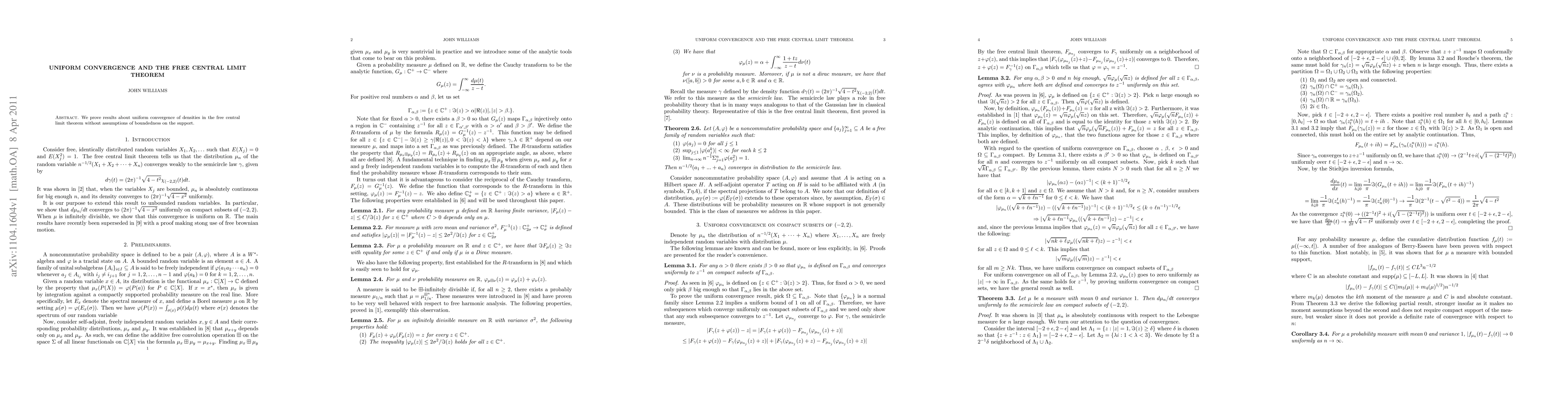 Summary: This paper establishes uniform convergence of densities in the free central limit theorem, demonstrating results without requiring boundedness assumptions on the support. The findings advance understanding of convergence properties in non-traditional statistical frameworks.