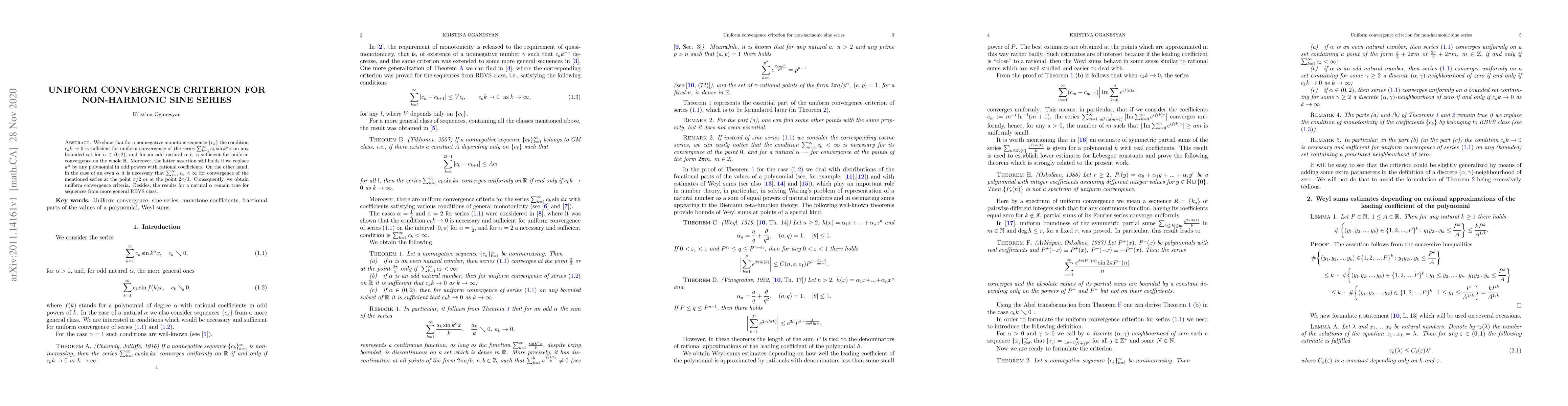 This paper establishes a uniform convergence criterion for non-harmonic sine series, proving that a nonnegative monotone sequence $\{c_k\}$ with $c_kk\to 0$ ensures uniform convergence for $\alpha\in(0,2)$ on bounded sets and for odd $\alpha$ on $\mathbb{R}$. It also discusses necessary conditions for convergence when $\alpha$ is even.