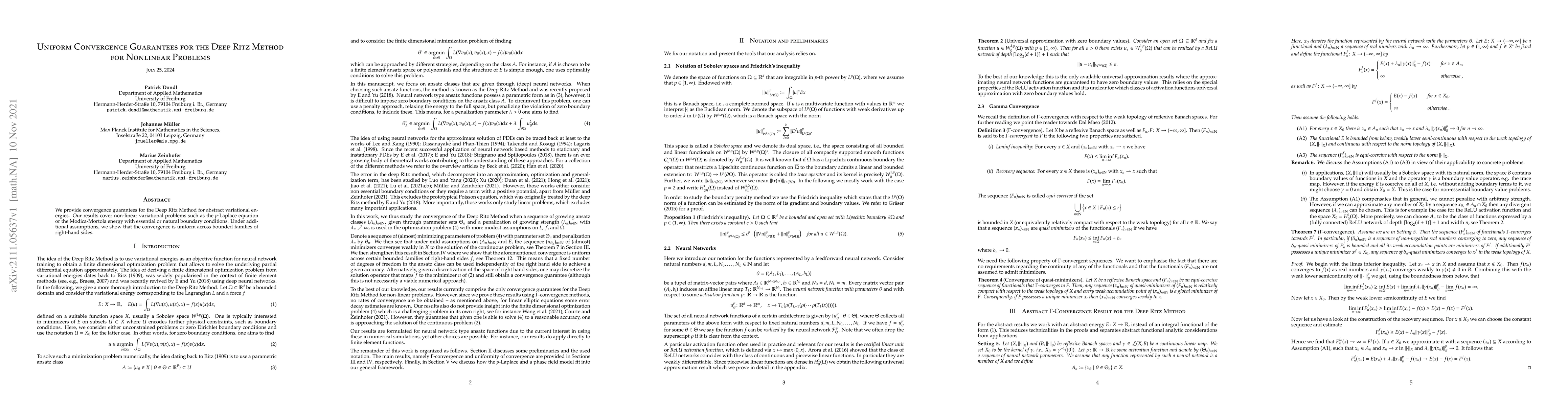 We provide convergence guarantees for the Deep Ritz Method for abstract variational energies. Our results cover non-linear variational problems such as the $p$-Laplace equation or the Modica-Mortola energy with essential or natural boundary conditions. Under additional assumptions, we show that the convergence is uniform across % bounded families of right-hand sides.