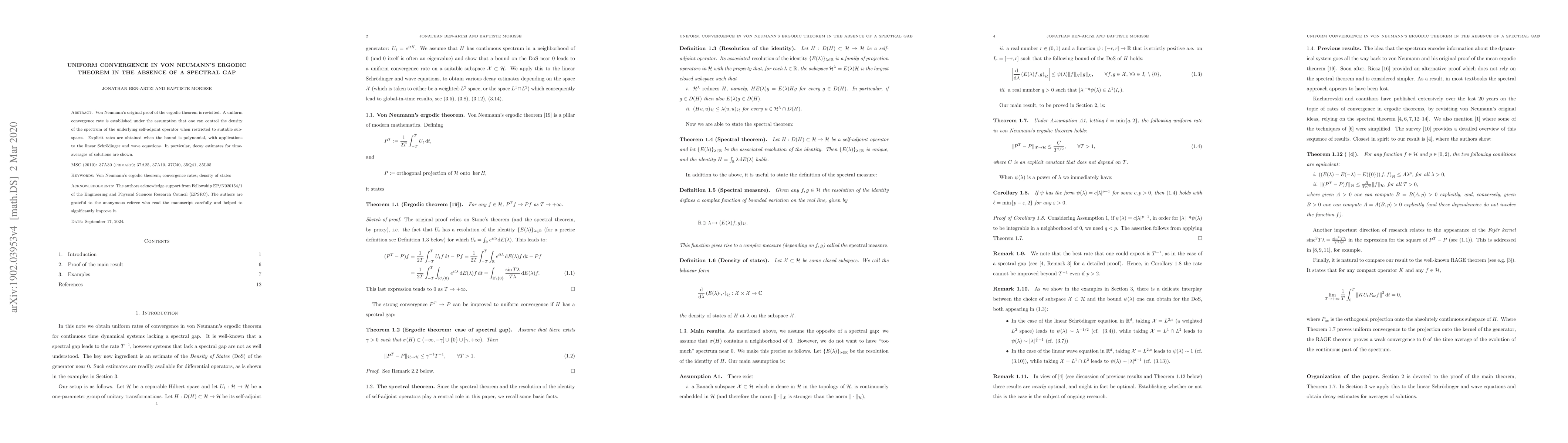 This paper revisits von Neumann's ergodic theorem and establishes a uniform convergence rate without requiring a spectral gap. It provides explicit decay estimates for time-averages of solutions to linear Schrödinger and wave equations under polynomial spectral density bounds.