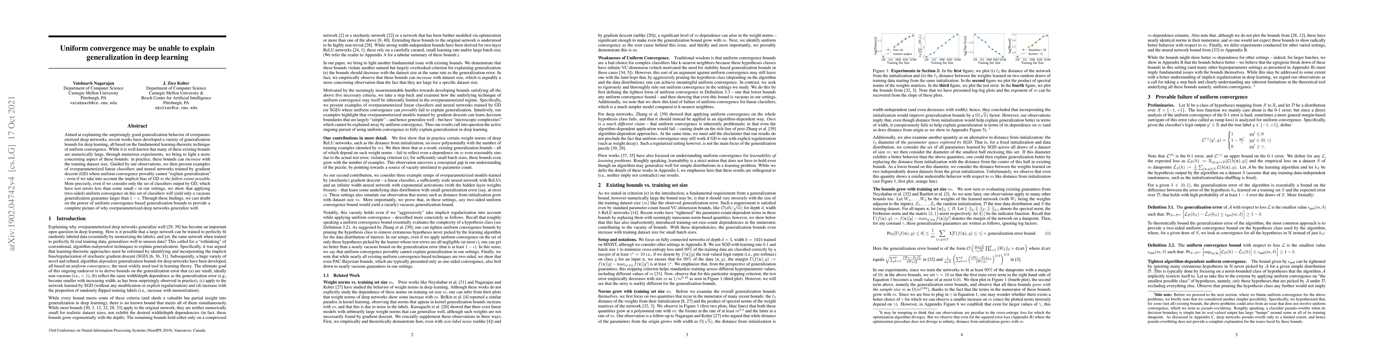 This paper argues that uniform convergence cannot fully explain the generalization ability of overparameterized deep networks, as it can lead to vacuous generalization bounds that increase with larger training datasets. The authors demonstrate this through examples of overparameterized linear classifiers and neural networks, showing that even within the set of classifiers with low test errors, uniform convergence fails to provide meaningful generalization guarantees.