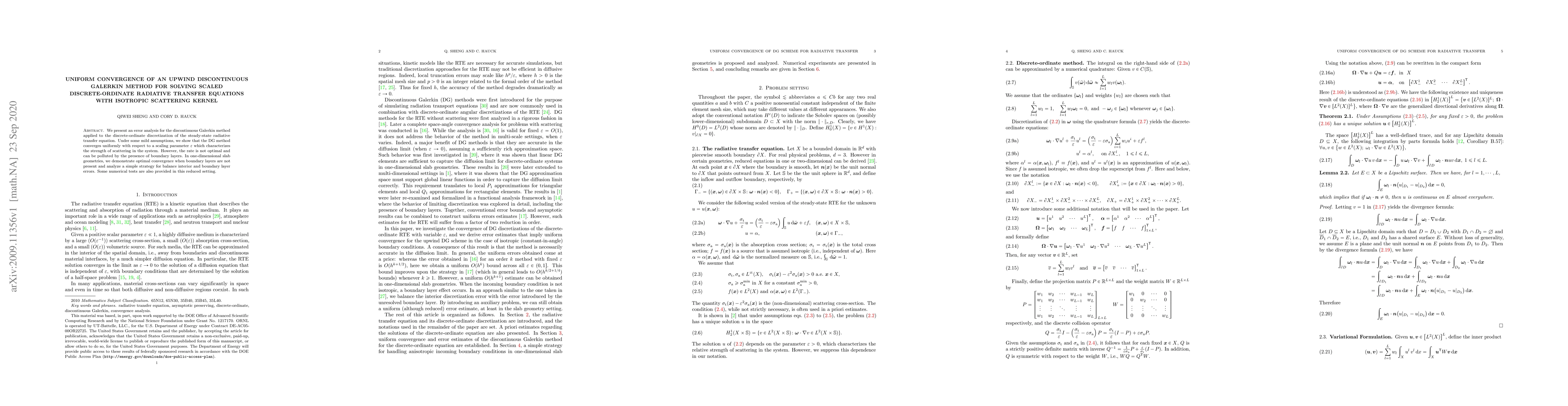 This paper analyzes the uniform convergence of an upwind discontinuous Galerkin method for solving radiative transfer equations with scattering, showing that it converges uniformly with respect to a scaling parameter but lacks optimal convergence rate due to boundary layers. In one-dimensional cases without boundary layers, optimal convergence is achieved, and a strategy to balance errors is proposed.