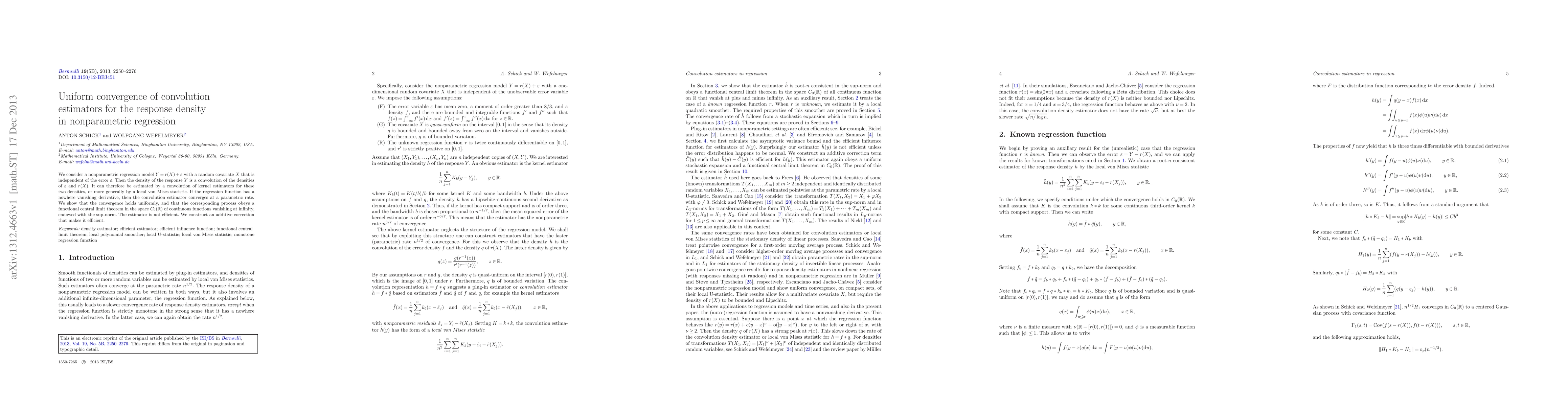 This paper investigates the uniform convergence of convolution estimators for the response density in nonparametric regression, demonstrating that under certain conditions, the estimator converges uniformly and follows a functional central limit theorem. An additive correction is proposed to improve the estimator's efficiency.