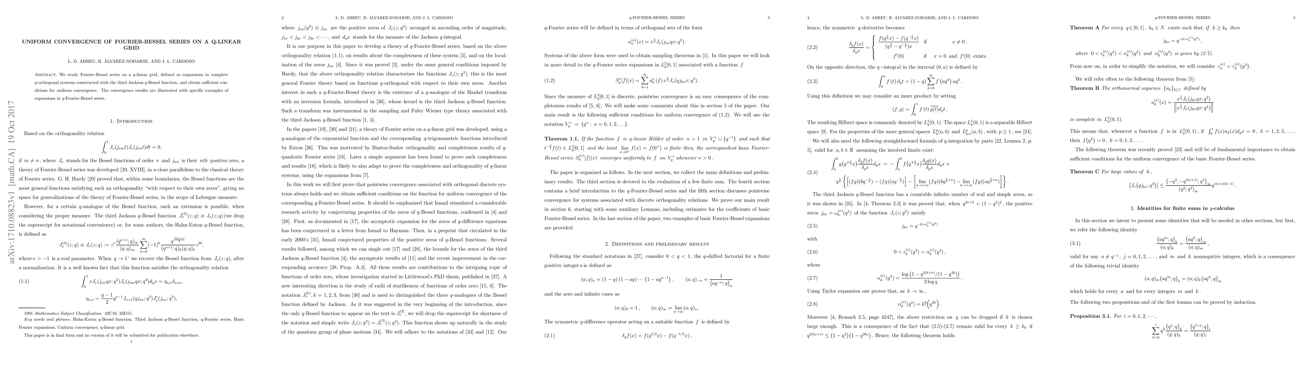 This paper investigates the uniform convergence of Fourier-Bessel series defined on a q-linear grid using the third Jackson q-Bessel function. It establishes sufficient conditions for uniform convergence and demonstrates the results with specific examples of q-Fourier-Bessel expansions.