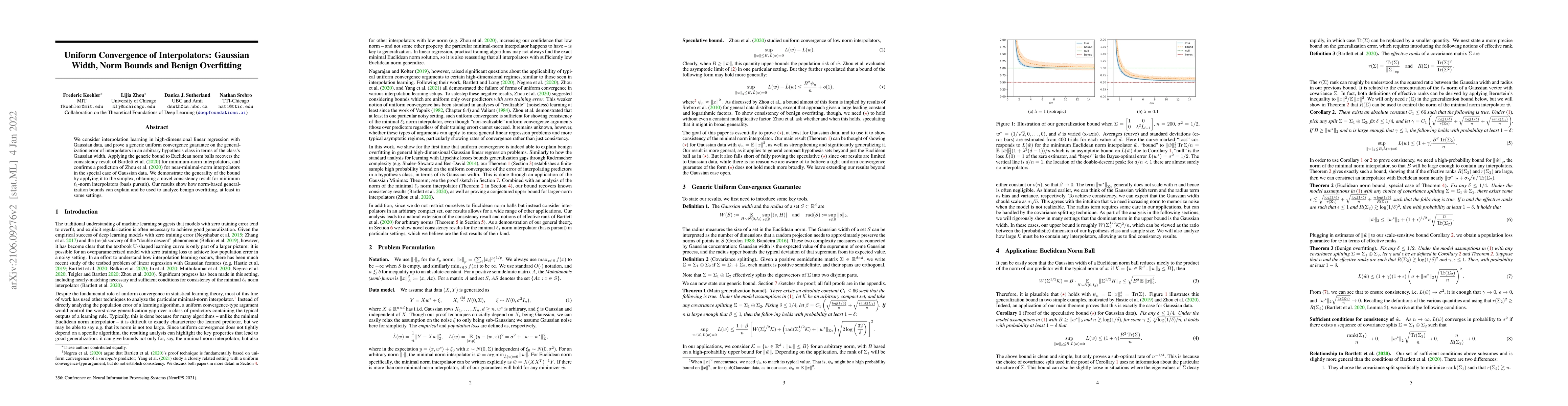 This paper proves a uniform convergence guarantee for interpolators in high-dimensional linear regression with Gaussian data, linking it to the Gaussian width of the hypothesis class. The results generalize previous findings on minimum-norm interpolators and provide new insights into benign overfitting.