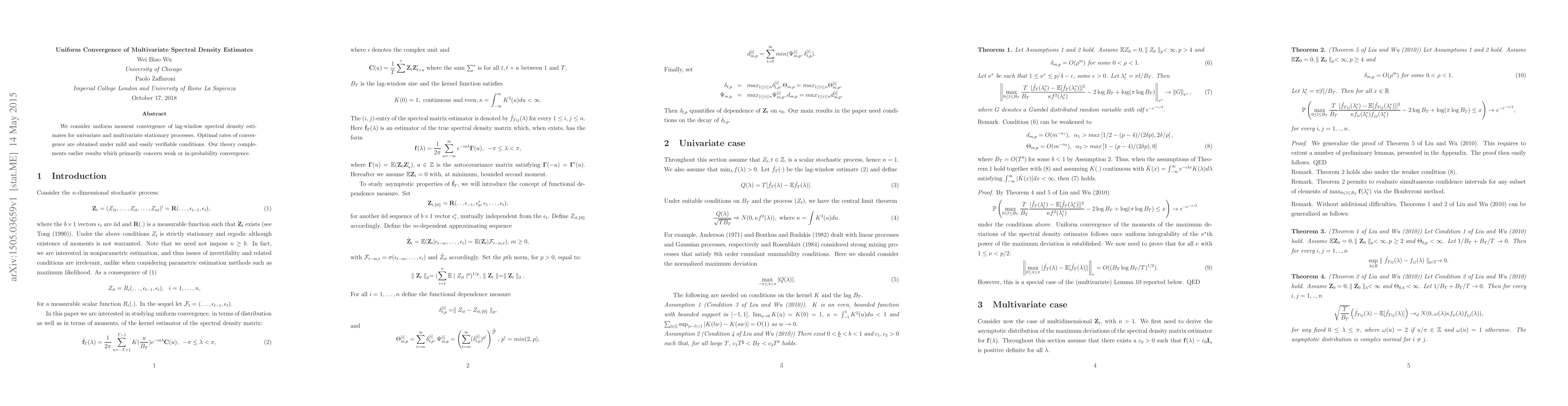 Summary: This paper investigates the uniform convergence of multivariate spectral density estimates for stationary processes, achieving optimal convergence rates under simple conditions, thereby expanding on previous results focused on weak convergence.