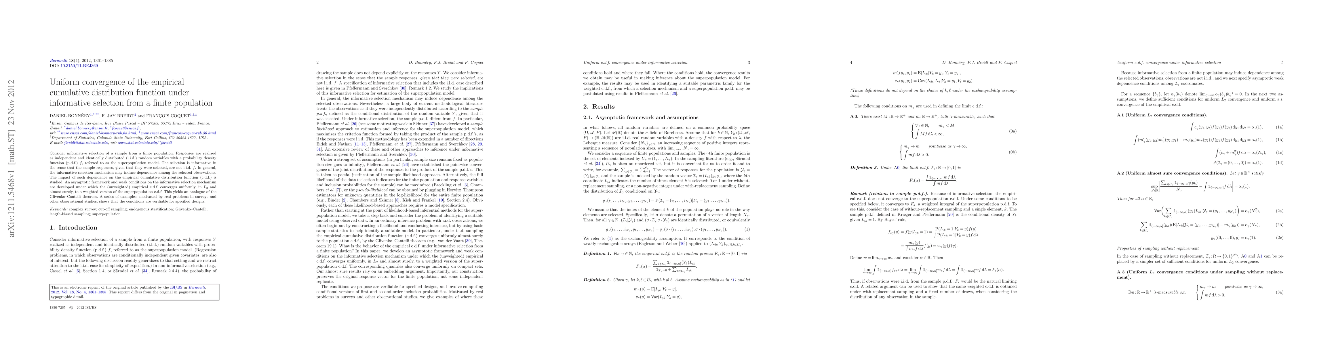 The study shows that informative selection of a sample from a finite population can lead to uniform convergence of the empirical cumulative distribution function to a weighted version of the superpopulation model's c.d.f., with conditions on the selection mechanism. The findings have implications for statistical inference in surveys and observational studies.