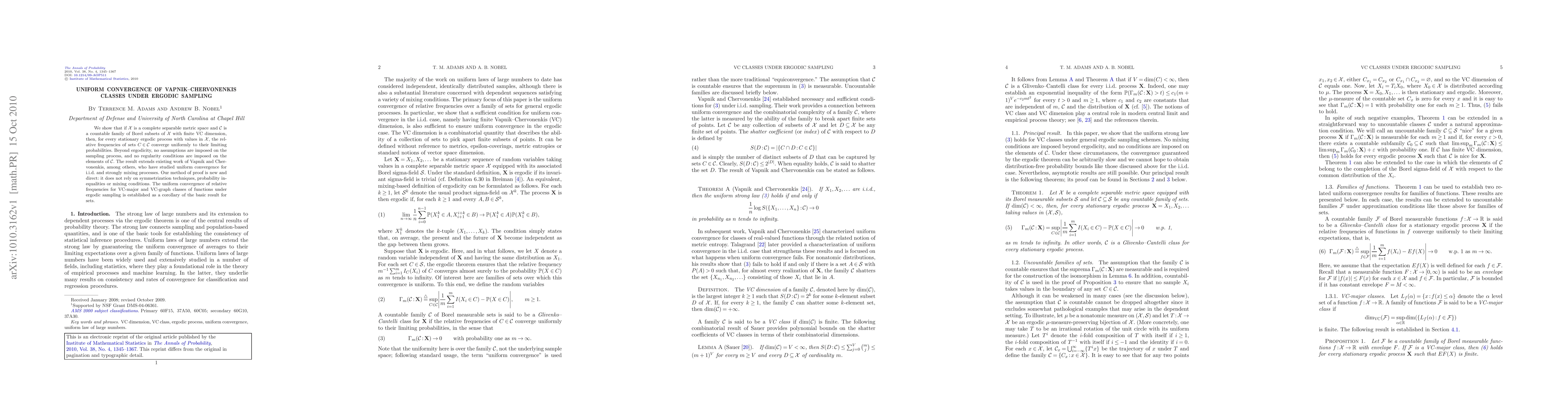 This paper demonstrates uniform convergence of relative frequencies of sets in a Vapnik-Chervonenkis class under an ergodic sampling process, without additional assumptions beyond stationarity and ergodicity. The proof method is novel and extends previous uniform convergence results for independent and mixing processes.