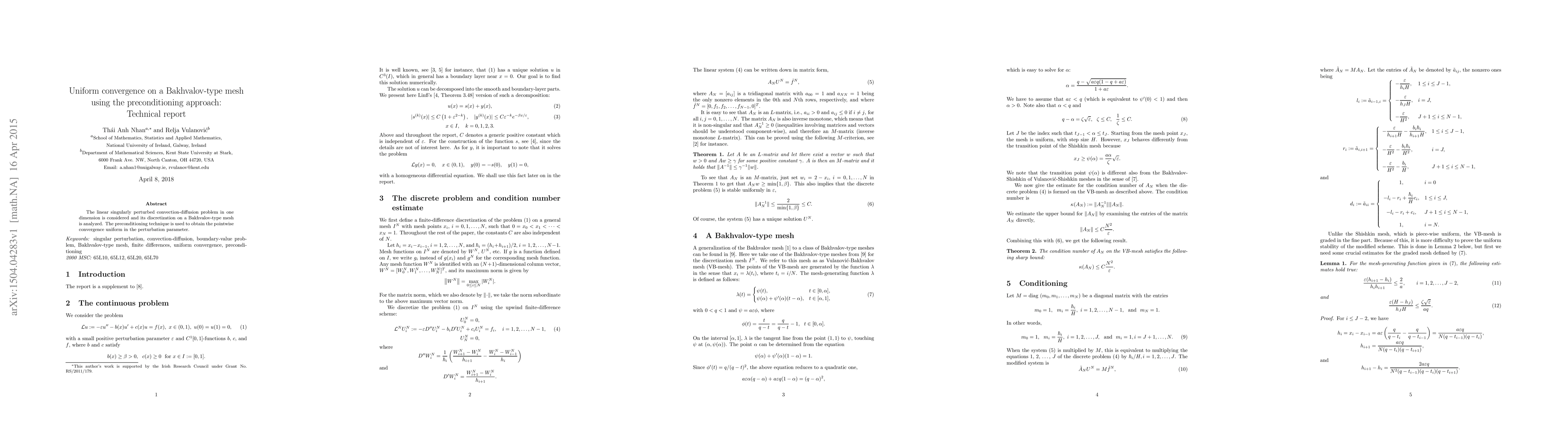 This technical report analyzes the discretization of a 1D singularly perturbed convection-diffusion problem on a Bakhvalov-type mesh, employing a preconditioning technique to ensure uniform pointwise convergence in the perturbation parameter.