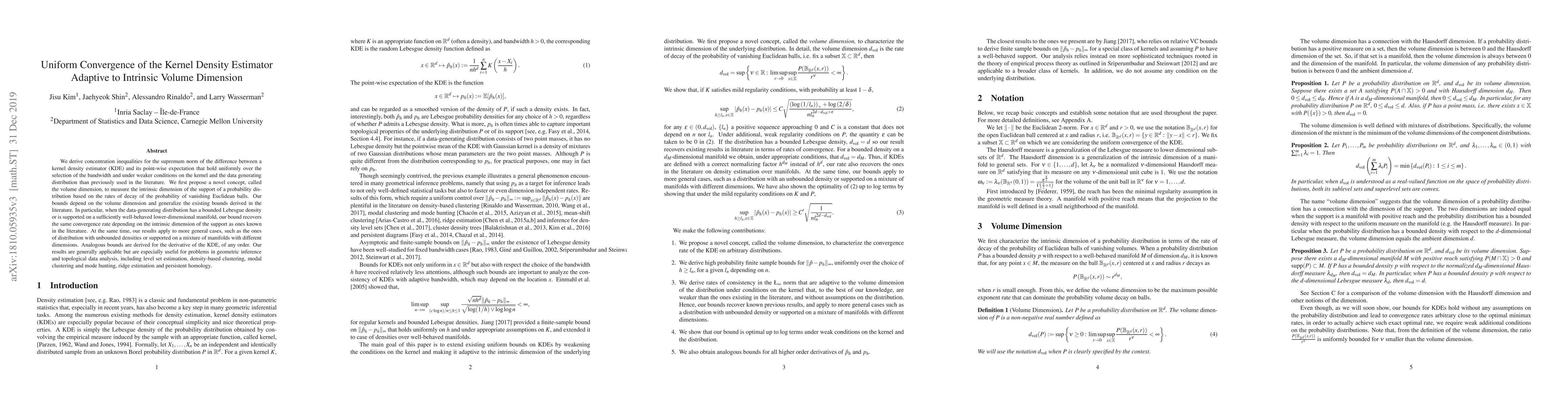 This paper derives concentration inequalities for the kernel density estimator's supremum norm, adapting to the intrinsic volume dimension for more general data distributions. The novel volume dimension concept generalizes existing convergence rate bounds and is useful for geometric inference and topological data analysis.