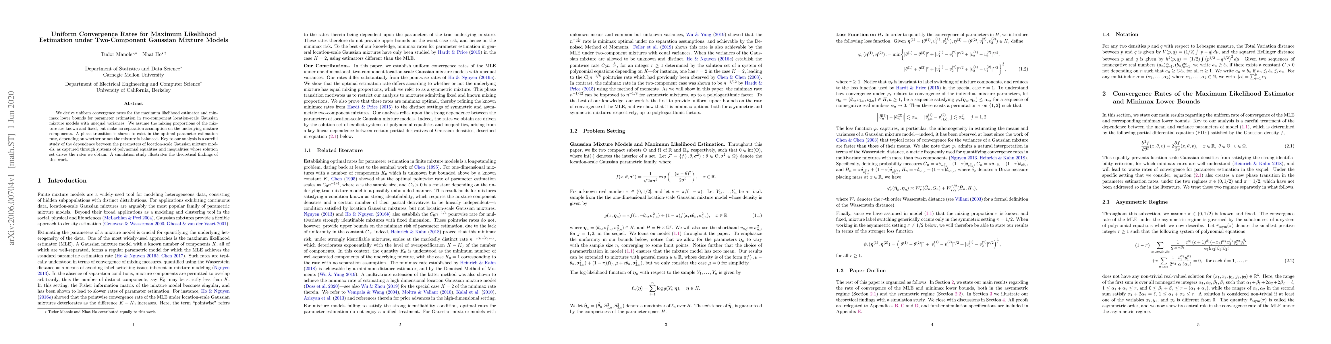 This paper derives uniform convergence rates for maximum likelihood estimation in two-component Gaussian mixture models, revealing a phase transition based on whether the mixture is balanced. The analysis hinges on studying the dependence between parameters through polynomial systems, and a simulation study supports the theoretical results.