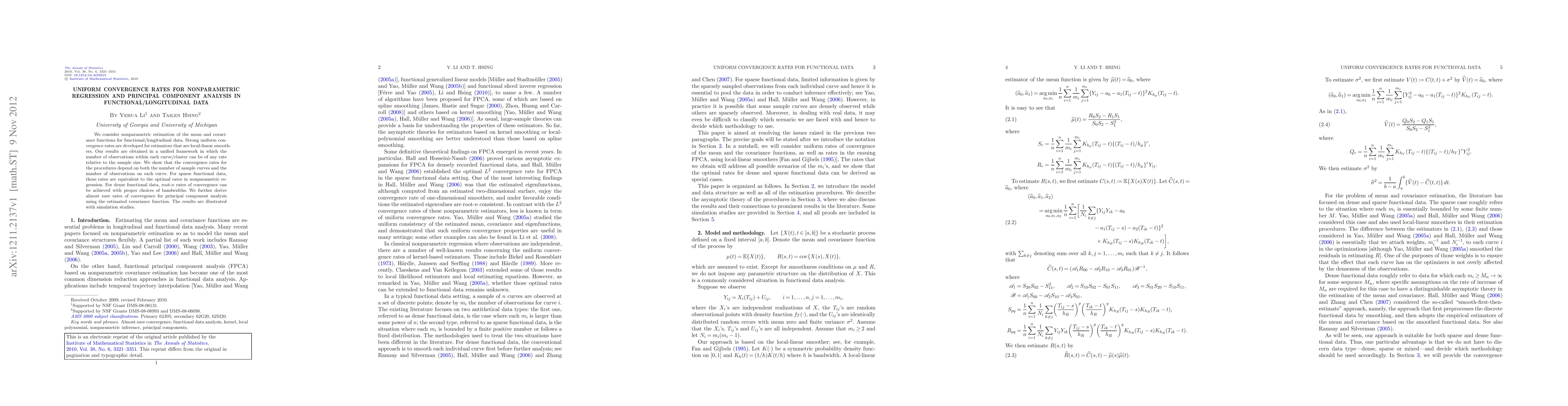 This paper develops strong uniform convergence rates for local-linear smoothers in nonparametric regression for functional/longitudinal data, showing that the rates depend on both the number of sample curves and observations per curve. It also derives almost sure convergence rates for principal component analysis based on the estimated covariance function.