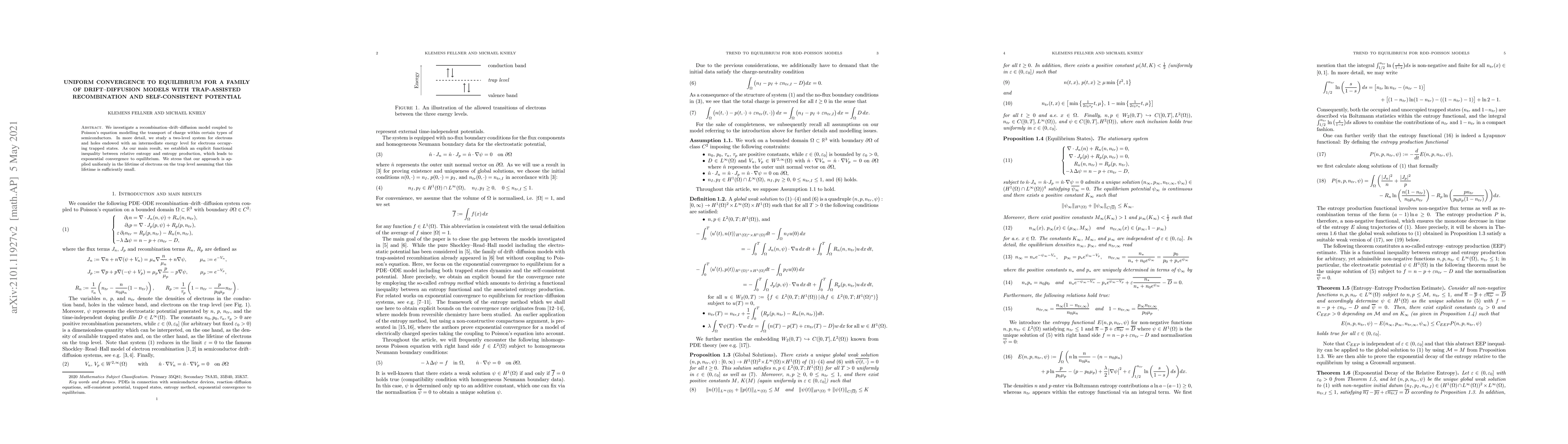 We investigate a recombination-drift-diffusion model coupled to Poisson's equation modelling the transport of charge within certain types of semiconductors. In more detail, we study a two-level system for electrons and holes endowed with an intermediate energy level for electrons occupying trapped states. As our main result, we establish an explicit functional inequality between relative entropy and entropy production, which leads to exponential convergence to equilibrium. We stress that our approach is applied uniformly in the lifetime of electrons on the trap level assuming that this lifetime is sufficiently small.