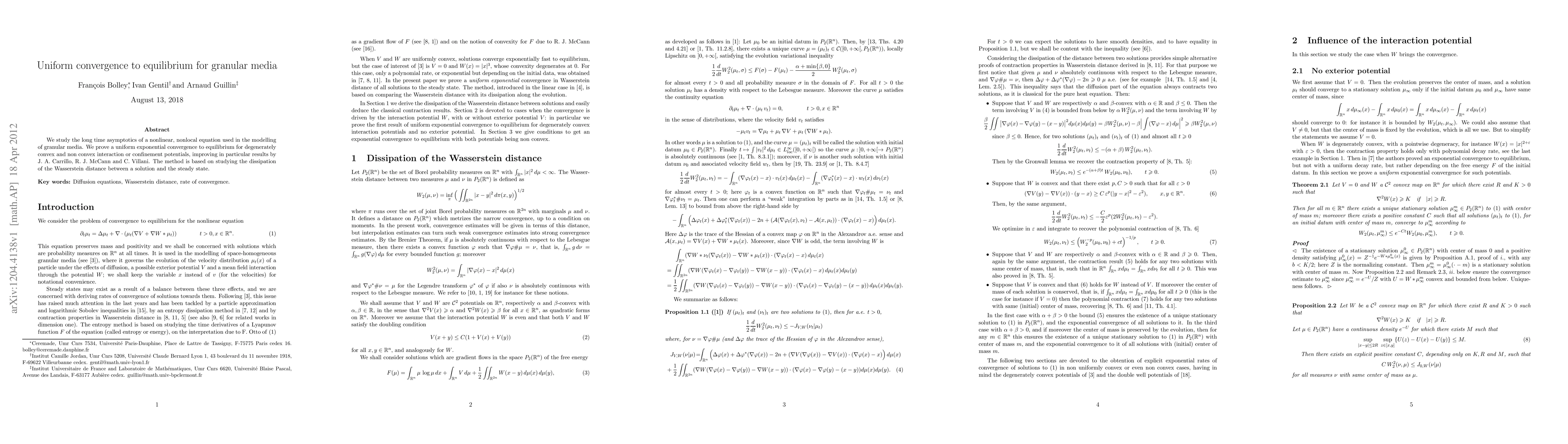 We study the long time asymptotics of a nonlinear, nonlocal equation used in the modelling of granular media. We prove a uniform exponential convergence to equilibrium for degenerately convex and non convex interaction or confinement potentials, improving in particular results by J. A. Carrillo, R. J. McCann and C. Villani. The method is based on studying the dissipation of the Wasserstein distance between a solution and the steady state.