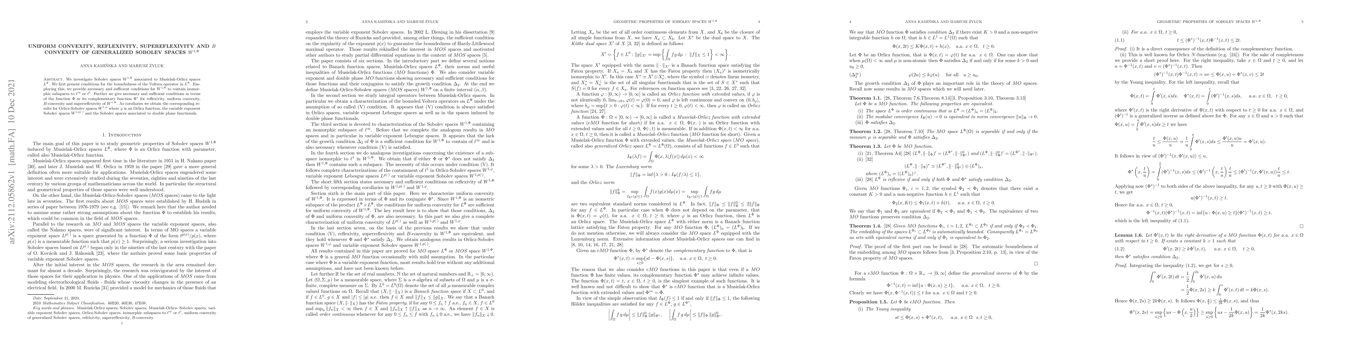 We investigate Sobolev spaces $W^{1,\Phi}$ associated to Musielak-Orlicz spaces $L^\Phi$. We first present conditions for the boundedness of the Voltera operator in $L^\Phi$. Employing this, we provide necessary and sufficient conditions for $W^{1,\Phi}$ to contain isomorphic subspaces to $\ell^\infty$ or $\ell^1$. Further we give necessary and sufficient conditions in terms of the function $\Phi$ or its complementary function $\Phi^*$ for reflexivity, uniform convexity, $B$-convexity and superreflexivity of $W^{1,\Phi}$. As corollaries we obtain the corresponding results for Orlicz-Sobolev spaces $W^{1,\varphi}$ where $\varphi$ is an Orlicz function, the variable exponent Sobolev spaces $W^{1,p(\cdot)}$ and the Sobolev spaces associated to double phase functionals.