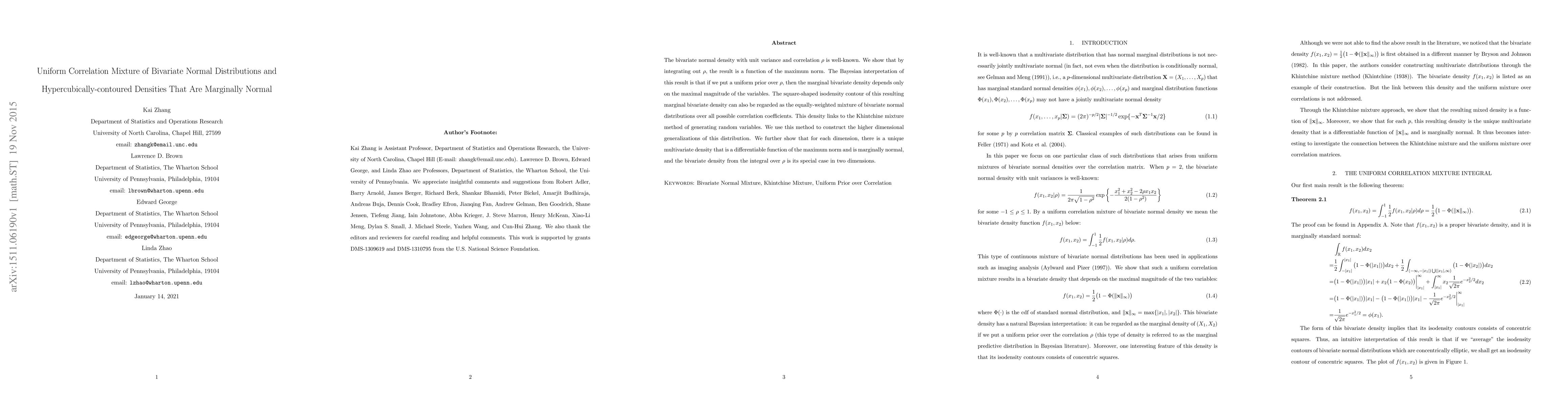 This paper explores the uniform correlation mixture of bivariate normal distributions, revealing that integrating out the correlation coefficient results in a density dependent only on the maximum norm. It connects this density to the Khintchine mixture method and extends it to higher dimensions, showing a unique multivariate density that is a differentiable function of the maximum norm and is marginally normal.