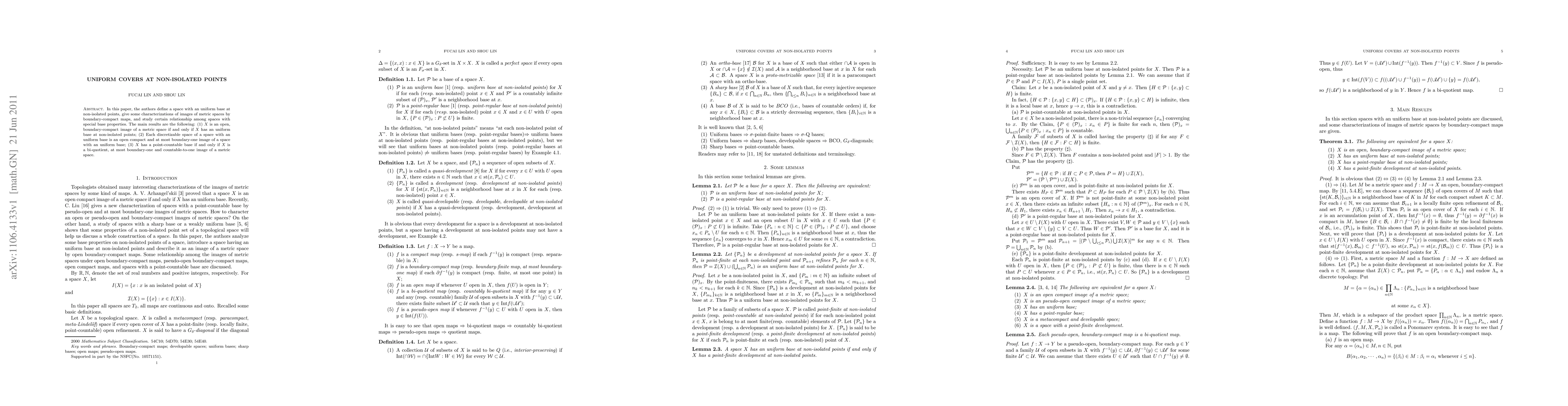 In this paper,\ the authors define a space with an uniform base at non-isolated points, give some characterizations of images of metric spaces by boundary-compact maps, and study certain relationship among spaces with special base properties.\ The main results are the following: (1)\ $X$ is an open,\ boundary-compact image of a metric space if and only if $X$ has an uniform base at non-isolated points; (2)\ Each discretizable space of a space with an uniform base is an open compact and at most boundary-one image of a space with an uniform base; (3)\ $X$ has a point-countable base if and only if $X$ is a bi-quotient,\ at most boundary-one and countable-to-one image of a metric space.