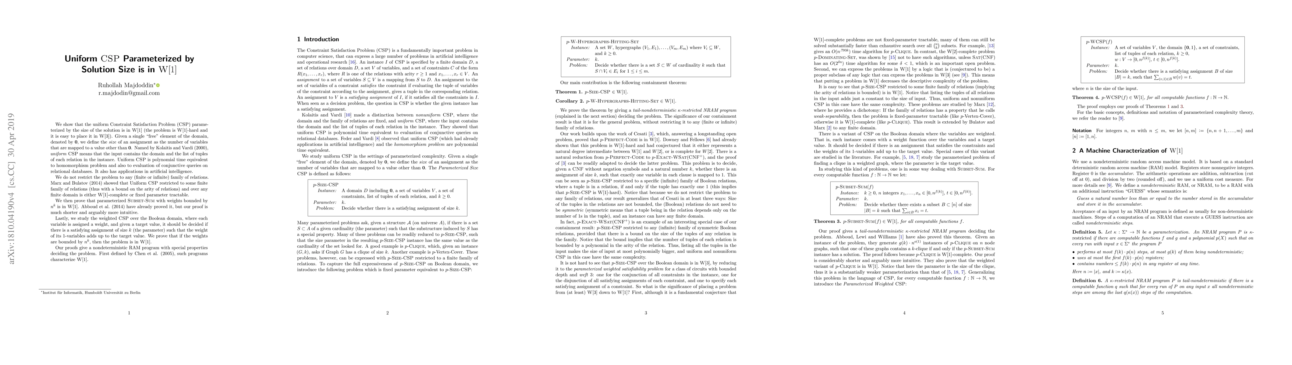 We show that the uniform Constraint Satisfaction Problem (CSP) parameterized by the size of the solution is in W[1] (the problem is W[1]-hard and it is easy to place it in W[3]). Given a single "free" element of the domain, denoted by $0$, we define the size of an assignment as the number of variables that are mapped to a value other than $0$. Named by Kolaitis and Vardi (2000), uniform CSP means that the input contains the domain and the list of tuples of each relation in the instance. Uniform CSP is polynomial time equivalent to homomorphism problem and also to evaluation of conjunctive queries on relational databases. It also has applications in artificial intelligence. We do not restrict the problem to any (finite or infinite) family of relations. Marx and Bulatov (2014) showed that Uniform CSP restricted to some finite family of relations (thus with a bound on the arity of relations) and over any finite domain is either W[1]-complete or fixed parameter tractable. We then prove that parameterized Subset Sum with weights bounded by $n^k$ is in W[1]. Abboud et al. (2014) have already proved it, but our proof is much shorter and arguably more intuitive. Lastly, we study the weighted CSP over the Boolean Domain, where each variable is assigned a weight, and given a target value, it should be decided if there is a satisfying assignment of size $k$ (the parameter) such that the weight of its $1$-variables adds up to the target value. We prove that if the weights are bounded by $n^k$, then the problem is in W[1]. Our proofs give a nondeterministic RAM program with special properties deciding the problem. First defined by Chen et al. (2005), such programs characterize W[1].