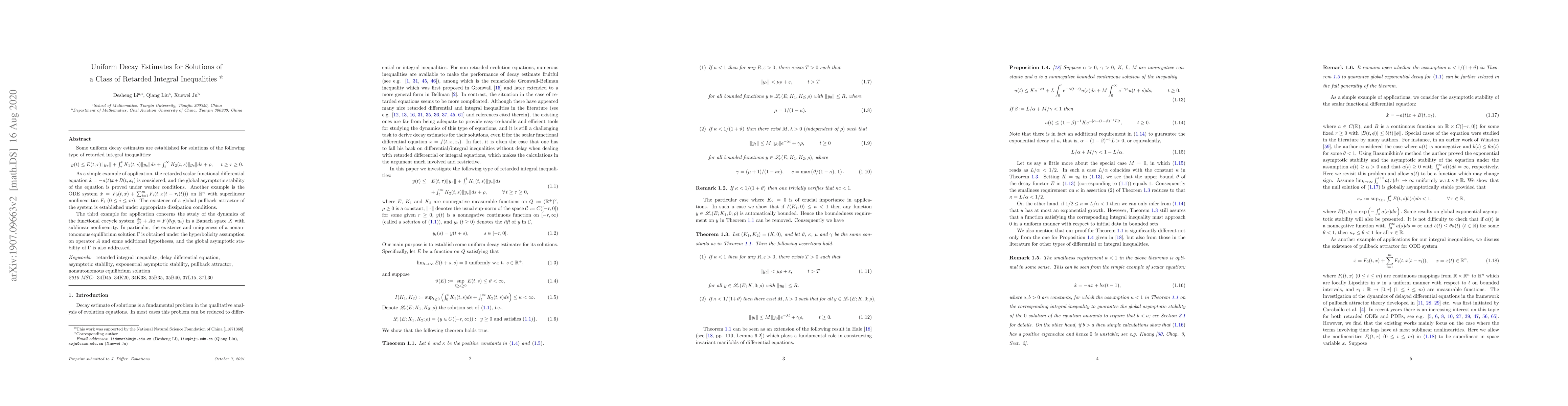 Some uniform decay estimates are established for solutions of the following type of retarded integral inequalities: $$y(t)\leq E(t,\tau)||y_\tau||+\int_\tau^t K_1(t,s)||y_s||ds+\int_t^\infty K_2(t,s)||y_s||ds+\rho, \hspace{0.5cm} t\geq\tau\geq 0.$$ As a simple example of application, the retarded scalar functional differential equation $\dot x=-a(t)x+B(t,x_t)$ is considered, and the global asymptotic stability of the equation is proved under weaker conditions. Another example is the ODE system $\dot x=F_0(t,x)+\sum_{i=1}^m F_i(t,x(t-r_i(t)))$ on $R^n$ with superlinear nonlinearities $F_i$ ($0\leq i\leq m$). The existence of a global pullback attractor of the system is established under appropriate dissipation conditions. The third example for application concerns the study of the dynamics of the functional cocycle system $\frac{du}{dt}+Au=F(\theta_tp,u_t)$ in a Banach space $X$ with sublinear nonlinearity. In particular, the existence and uniqueness of a nonautonomous stationary solution $\Gamma$ is obtained under the hyperbolicity assumption on operator $A$ and some additional hypotheses, and the global asymptotic stability of $\Gamma$ is also addressed.