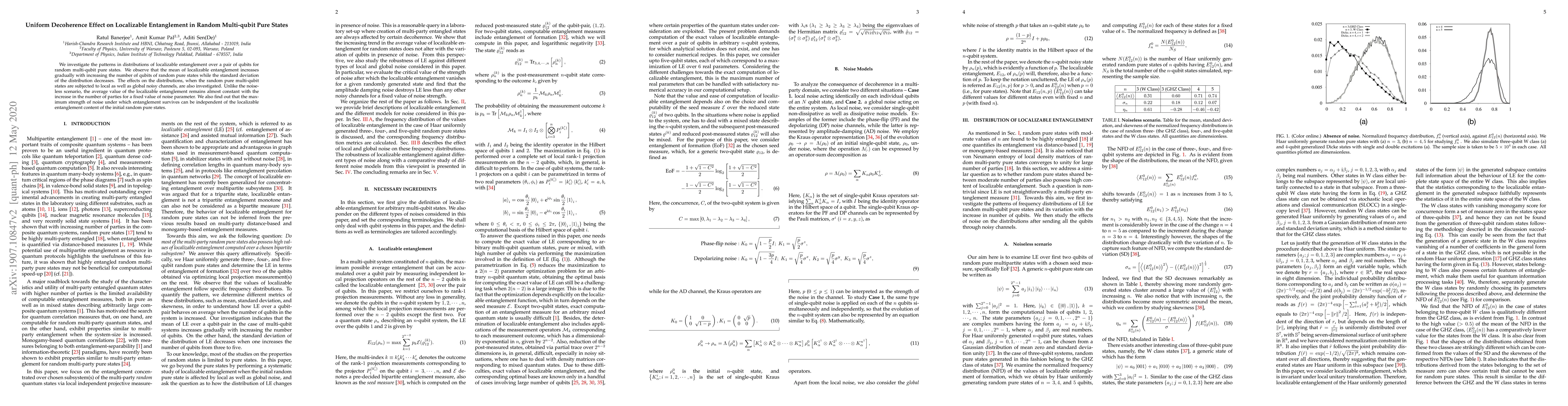 This paper explores how localizable entanglement in random multi-qubit pure states evolves with more qubits and under various noise conditions. It finds that while entanglement increases in noiseless scenarios, noise stabilizes average entanglement regardless of initial state complexity.