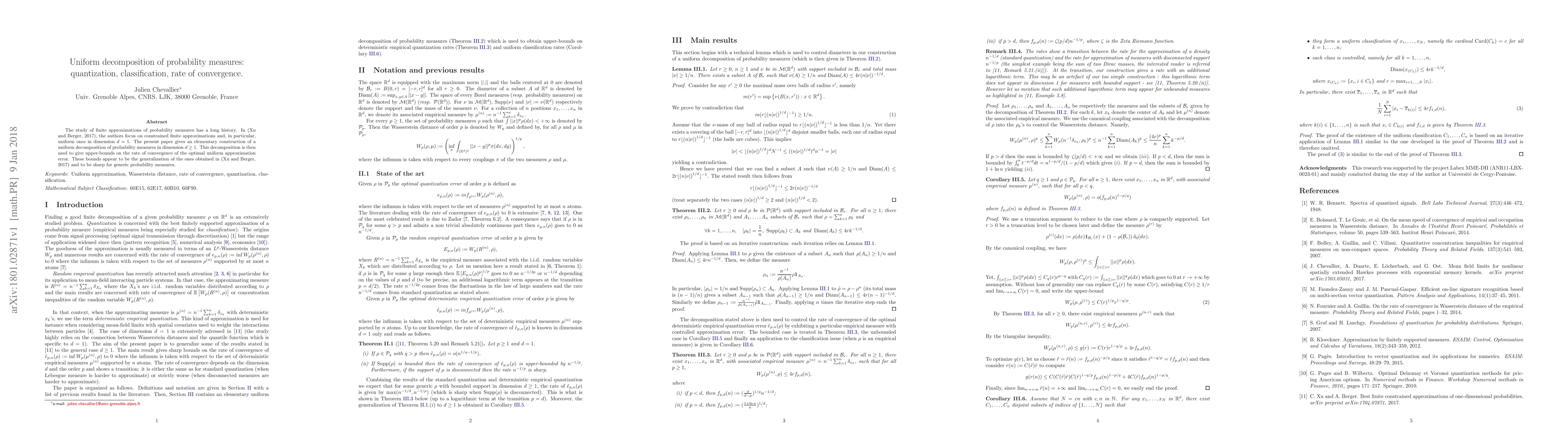 The study of finite approximations of probability measures has a long history. In (Xu and Berger, 2017), the authors focus on constrained finite approximations and, in particular, uniform ones in dimension $d=1$. The present paper gives an elementary construction of a uniform decomposition of probability measures in dimension $d\geq 1$. This decomposition is then used to give upper-bounds on the rate of convergence of the optimal uniform approximation error. These bounds appear to be the generalization of the ones obtained in (Xu and Berger, 2017) and to be sharp for generic probability measures.