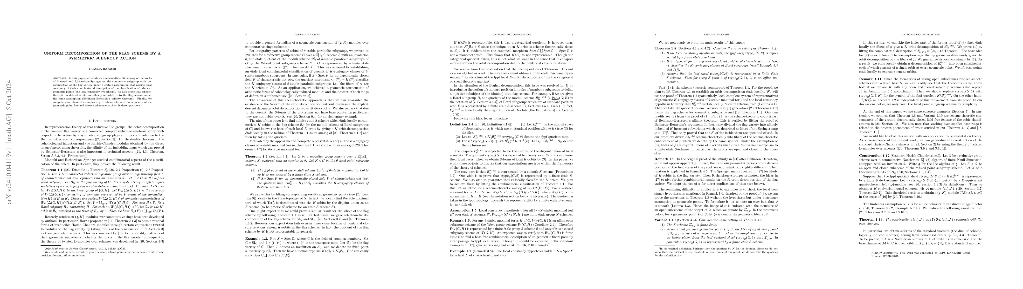 In this paper, we establish a scheme-theoretic analog of the works of Matsuki and Richardson--Springer on the symmetric subgroup orbit decomposition of the flag variety under a certain assumption that asserts local constancy of their combinatorial description of the classification of orbits at geometric points (the local constancy hypothesis). We also prove that scheme-theoretic models of orbits are affinely imbedded into the flag scheme under the same assumption (Beilinson--Bernstein's affinity theorem). Finally, we compute some classical examples to give scheme-theoretic consequences of the geometric point free and descent phenomena of orbit decompositions.