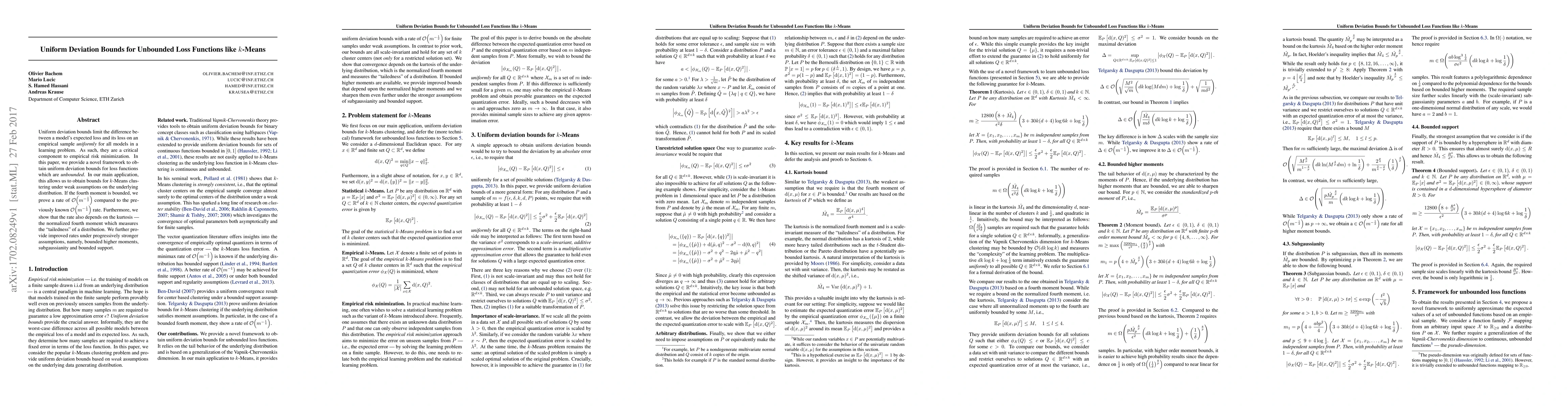This paper introduces a novel framework for obtaining uniform deviation bounds for unbounded loss functions, specifically applying it to improve bounds for $k$-Means clustering. It demonstrates a rate improvement to $\mathcal{O}\left(m^{-\frac12}\right)$ under bounded fourth moments, and shows that the rate also depends on the distribution's kurtosis.