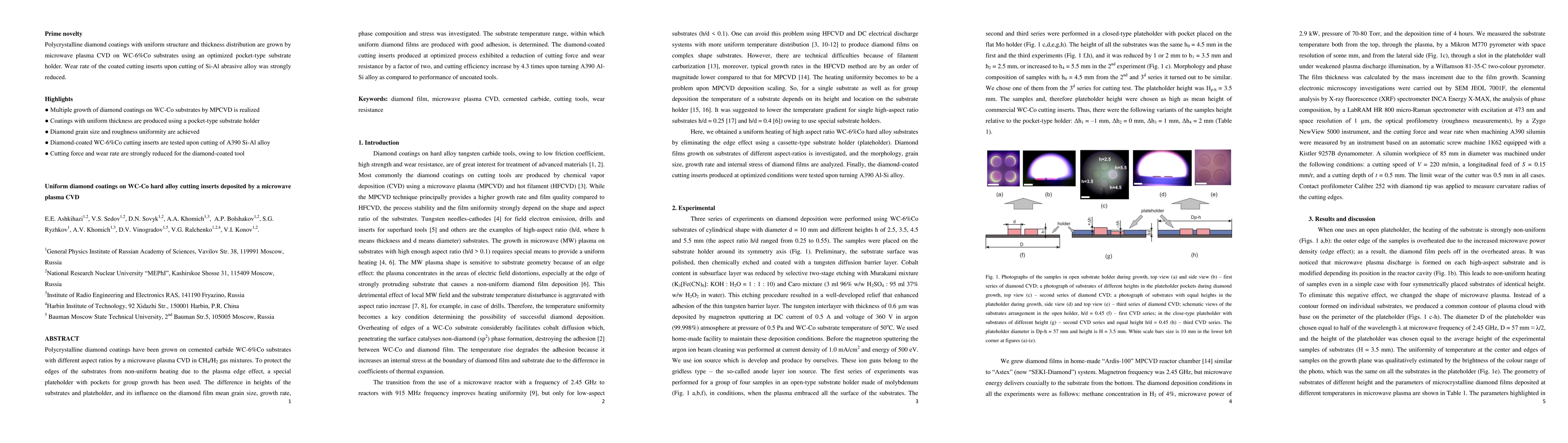 This study investigates uniform diamond coatings on WC-Co hard alloy cutting inserts via microwave plasma CVD, optimizing substrate temperature for uniform film growth and improved adhesion. The optimized process significantly reduces cutting force and wear, enhancing cutting efficiency by 4.3 times.