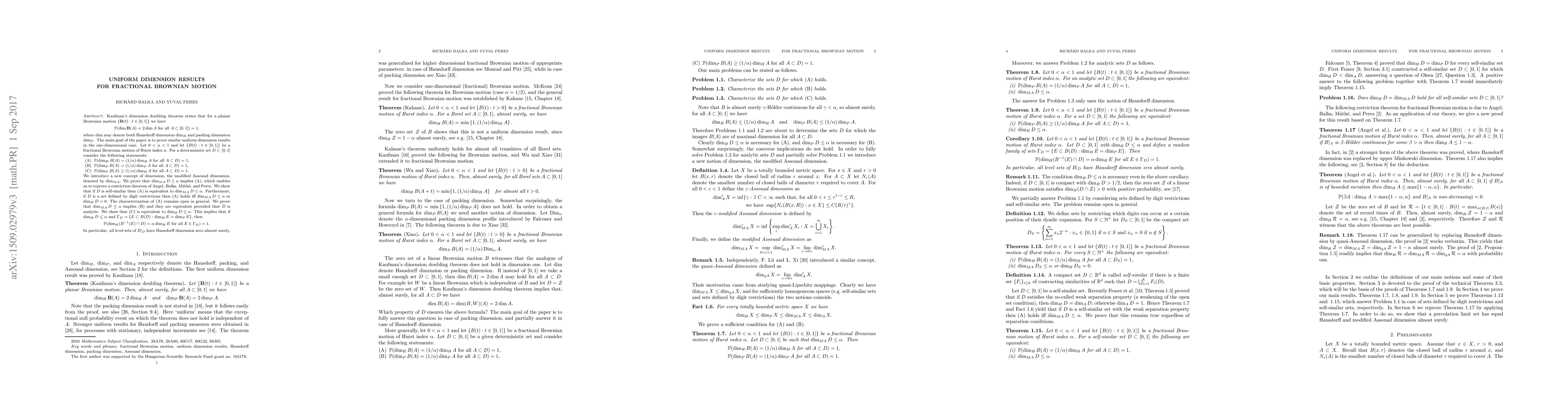 A study on fractional Brownian motion proves uniform dimension results for one-dimensional cases, showing that certain conditions lead to the Hausdorff and packing dimensions of a subset being equal to its modified Assouad dimension multiplied by the Hurst index.