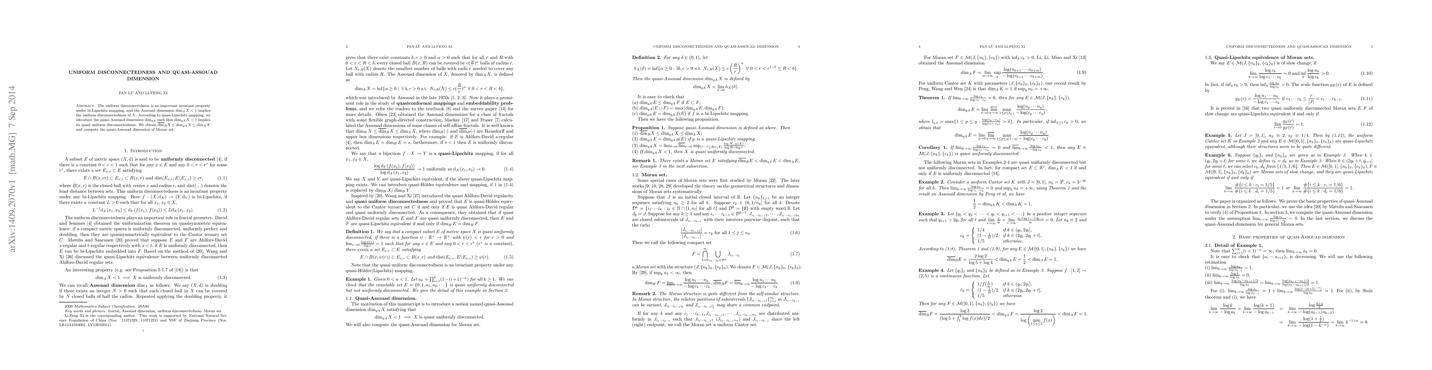This paper explores the concept of uniform disconnectedness and introduces the quasi-Assouad dimension, showing that $\dim _{qA}X<1$ leads to quasi uniform disconnectedness. It establishes the inequality $\overline{\dim }_{B}X\leq \dim _{qA}X\leq \dim _{A}X$ and computes the quasi-Assouad dimension for Moran sets.