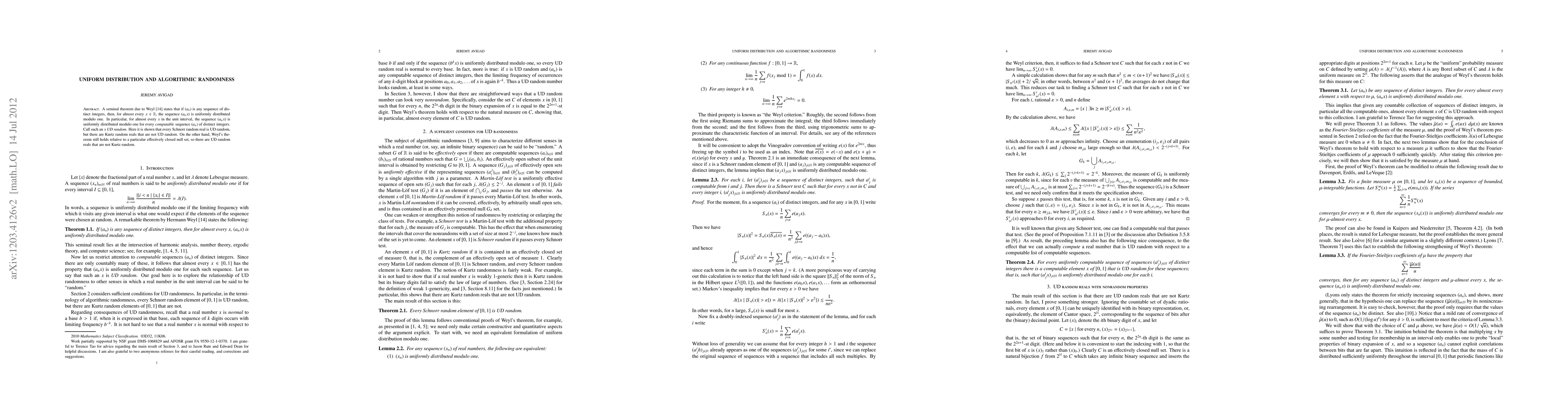 The paper extends Weyl's theorem on uniform distribution, applying it to algorithmic randomness, specifically showing relationships between Schnorr random and Kurtz random reals.