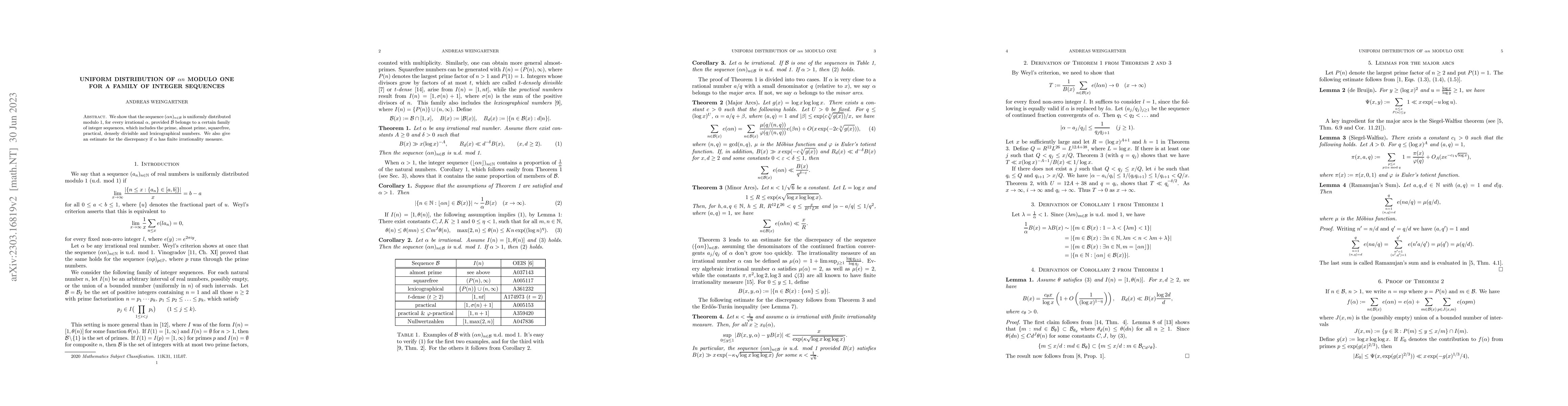 Summary: The paper demonstrates uniform distribution modulo one for the sequence $(\alpha n)_{n\in \mathcal{B}}$ for irrational $\alpha$ when $\mathcal{B}$ is from a specified family of integer sequences, including primes and other special types. It also provides a discrepancy estimate for $\alpha$ with finite irrationality measure.