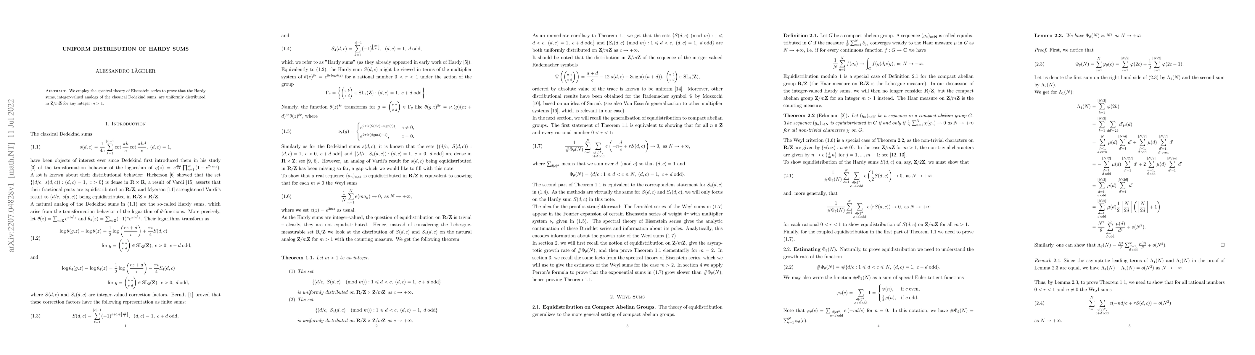 Summary: This paper uses spectral theory of Eisenstein series to demonstrate that Hardy sums, integer versions of Dedekind sums, are uniformly distributed in the modular arithmetic group $\mathbf{Z} / m \mathbf{Z}$ for any integer $m > 1$. The result extends the understanding of distribution properties of these sums.