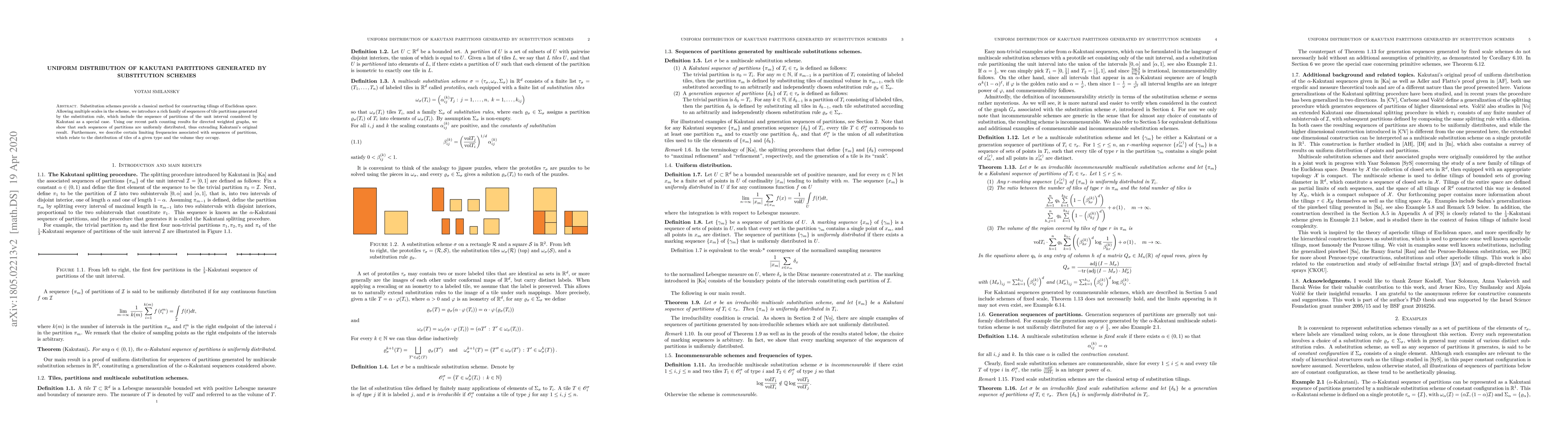 This paper extends Kakutani's original result on the uniform distribution of tile partitions generated by substitution schemes, demonstrating that sequences of partitions are uniformly distributed using recent path counting results for directed weighted graphs. It also explores limiting frequencies associated with these partitions, relating to the distribution and volume of tiles.