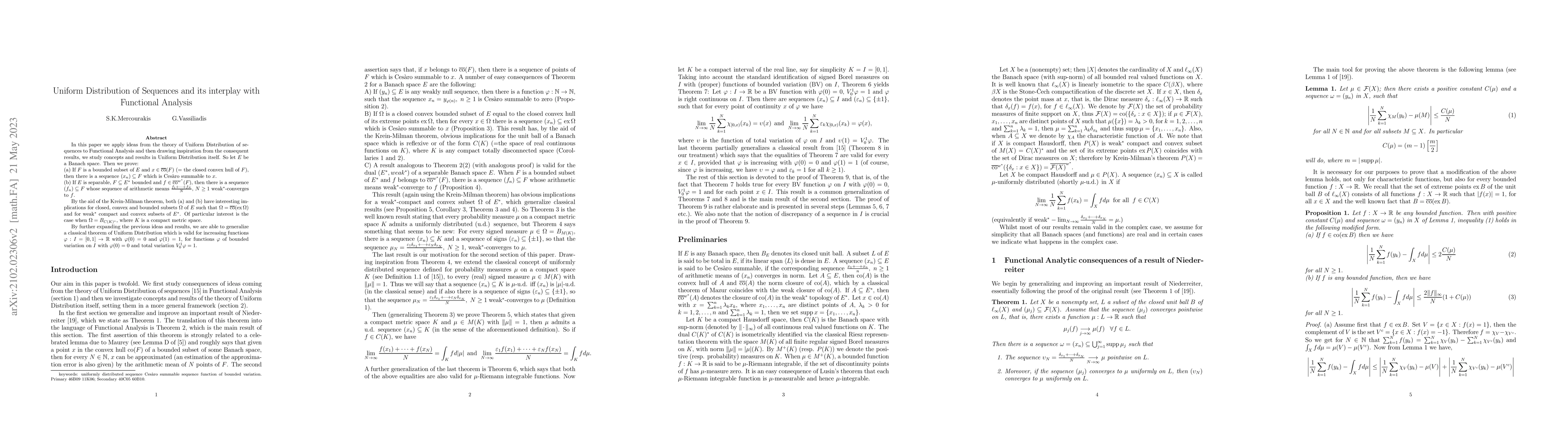 This paper explores the application of Uniform Distribution theory to Functional Analysis, proving results about sequences in Banach spaces that are Cesàro summable to elements within closed convex hulls. It also generalizes classical Uniform Distribution theorems for functions of bounded variation.