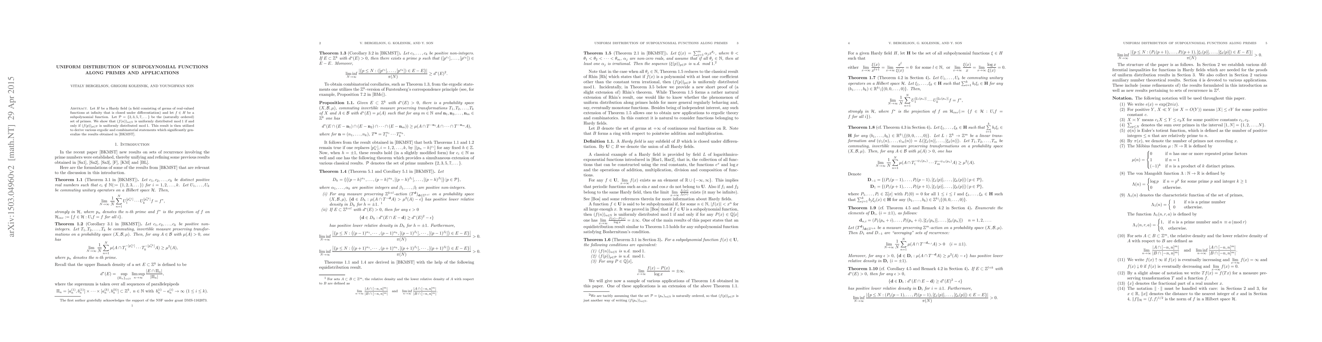 Let $H$ be a Hardy field (a field consisting of germs of real-valued functions at infinity that is closed under differentiation) and let $f \in H$ be a subpolynomial function. Let $\mathcal{P} = \{2, 3, 5, 7, \dots \}$ be the (naturally ordered) set of primes. We show that $(f(n))_{n \in \mathbb{N}}$ is uniformly distributed mod 1 if and only if $(f(p))_{p \in \mathcal{P}}$ is uniformly distributed mod 1. This result is then utilized to derive various ergodic and combinatorial statements which significantly generalize the results obtained in [BKMST].