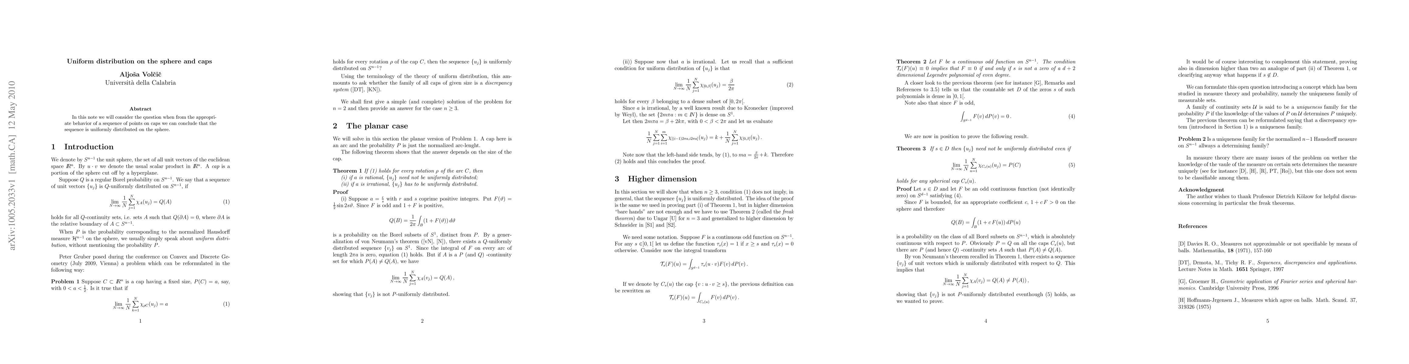 In this note we will consider the question when from the appropriate behavior of a sequence of points on caps we can conclude that the sequence is uniformly distributed on the sphere.