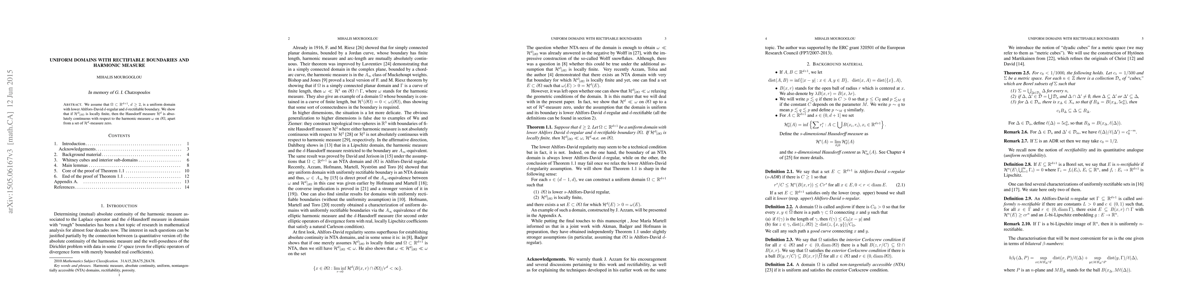 This paper investigates uniform domains in $\mathbb{R}^{d+1}$ with rectifiable boundaries, proving that if the $d$-dimensional Hausdorff measure on the boundary is locally finite, then the $d$-dimensional Hausdorff measure is absolutely continuous with respect to the harmonic measure on the boundary, except for a set of zero measure.