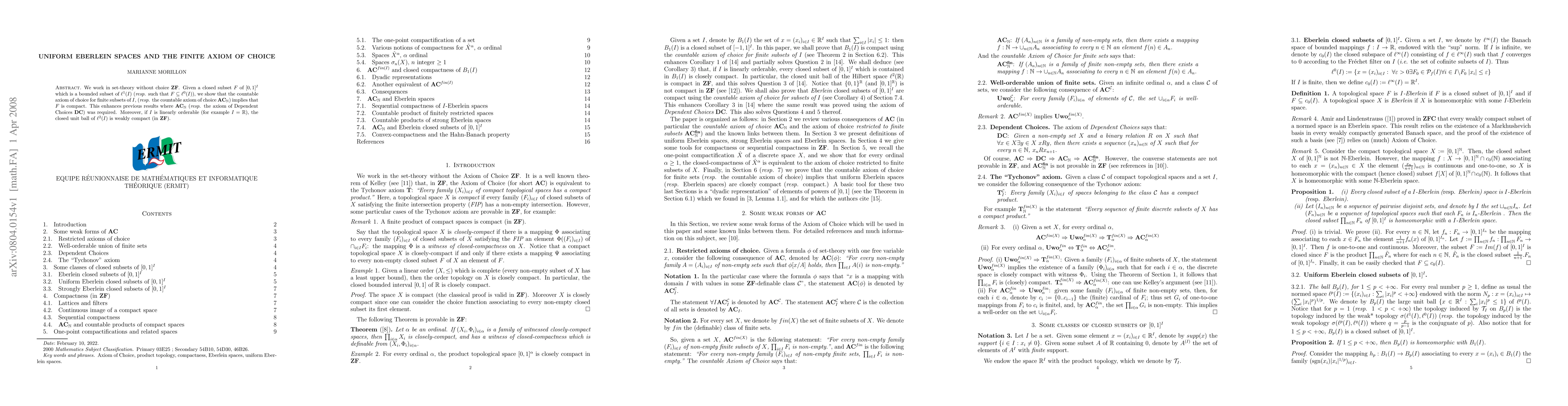 This paper explores the compactness of closed subsets in uniform Eberlein spaces within set theory without the full axiom of choice, showing that the countable axiom of choice for finite subsets suffices to prove compactness, enhancing previous results that required stronger choice principles. Additionally, it demonstrates weak compactness of the closed unit ball in $\ell^2(I)$ when $I$ is linearly orderable.