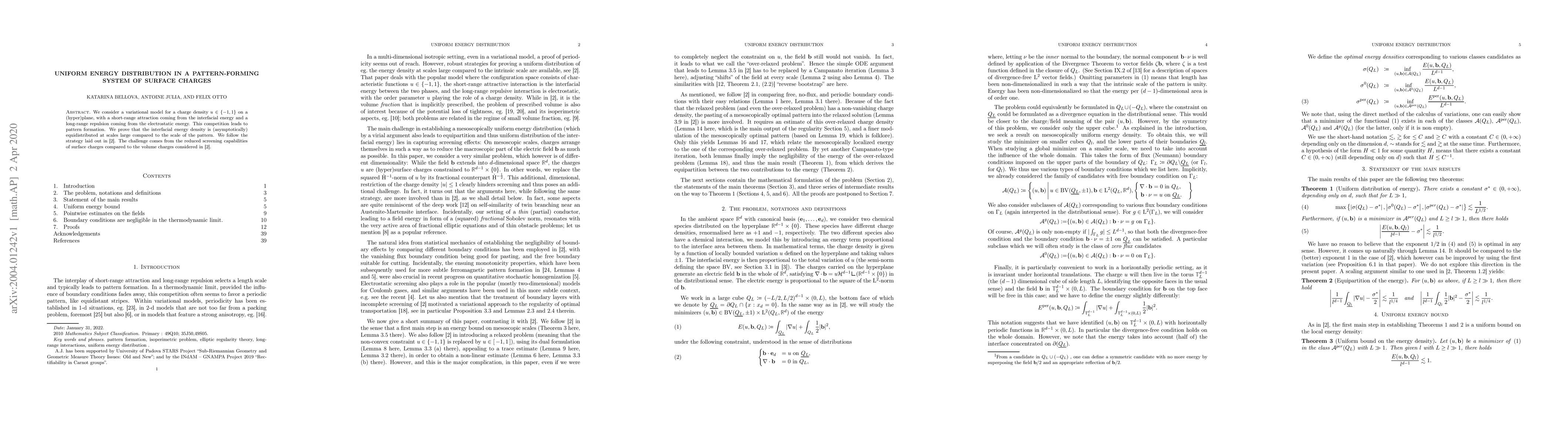 Researchers prove that in a system of surface charges with short-range attraction and long-range repulsion, the energy density is uniformly distributed at large scales. This finding has implications for understanding pattern formation in systems where surface charges interact differently than volume charges.