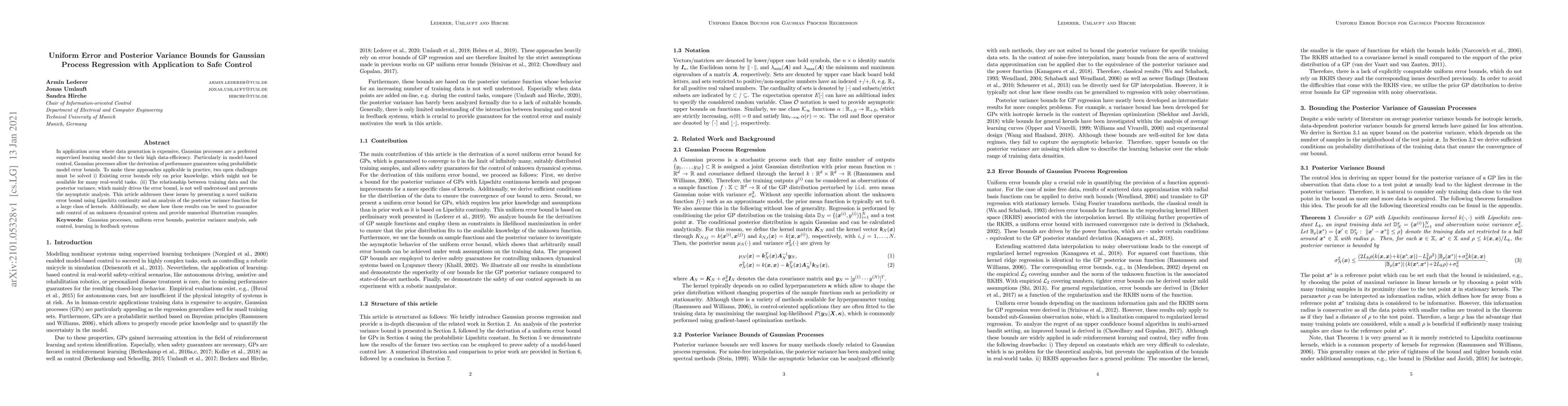 In application areas where data generation is expensive, Gaussian processes are a preferred supervised learning model due to their high data-efficiency. Particularly in model-based control, Gaussian processes allow the derivation of performance guarantees using probabilistic model error bounds. To make these approaches applicable in practice, two open challenges must be solved i) Existing error bounds rely on prior knowledge, which might not be available for many real-world tasks. (ii) The relationship between training data and the posterior variance, which mainly drives the error bound, is not well understood and prevents the asymptotic analysis. This article addresses these issues by presenting a novel uniform error bound using Lipschitz continuity and an analysis of the posterior variance function for a large class of kernels. Additionally, we show how these results can be used to guarantee safe control of an unknown dynamical system and provide numerical illustration examples.