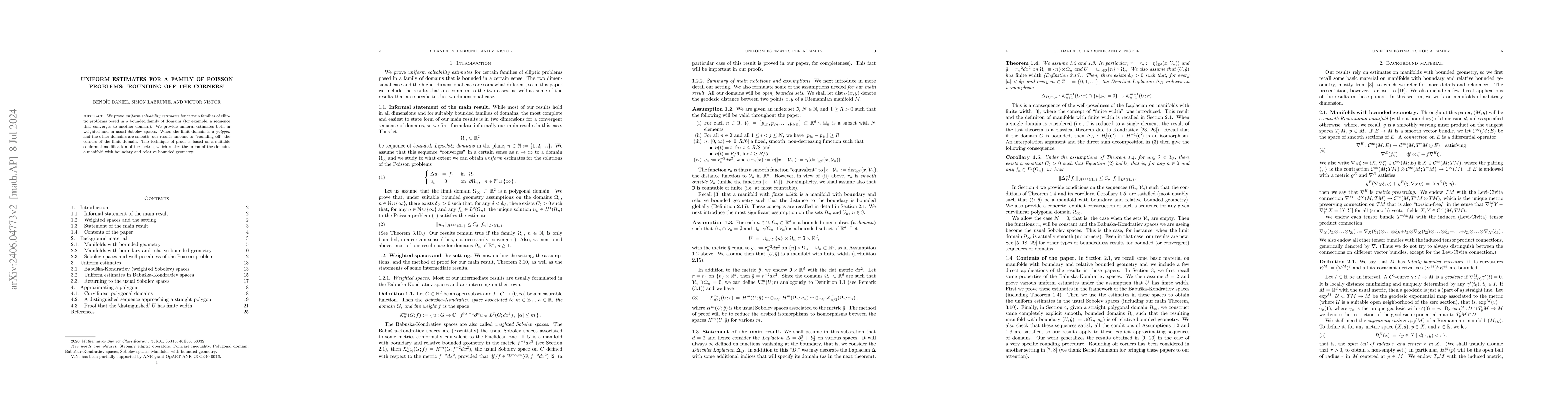 Summary: This paper establishes uniform solvability estimates for elliptic problems in converging domains, providing uniform estimates in weighted and standard Sobolev spaces. For polygonal limit domains, the results effectively "round up" the corners, achieved through conformal metric modification to ensure bounded geometry.