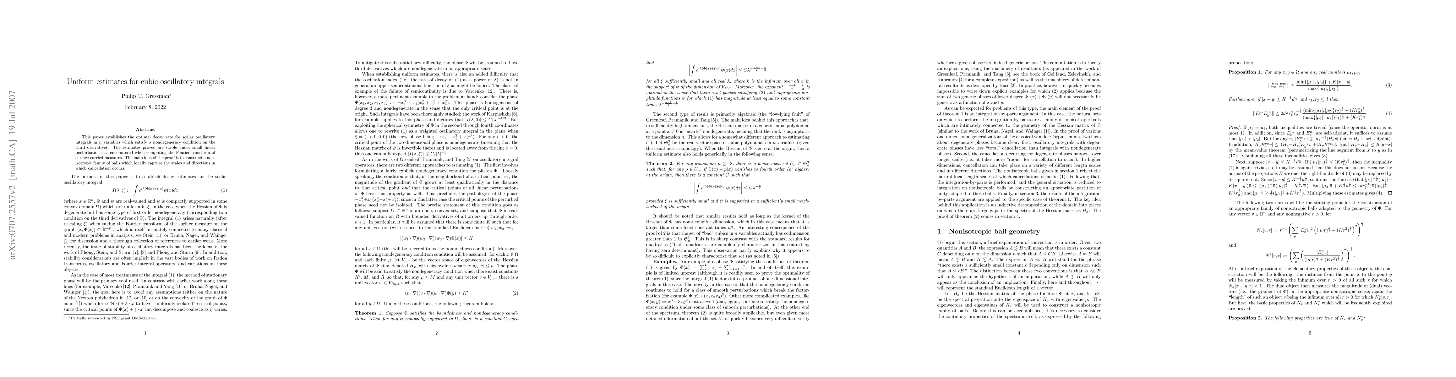 This paper establishes the optimal decay rate for scalar oscillatory integrals in $n$ variables which satisfy a nondegeneracy condition on the third derivatives. The estimates proved are stable under small linear perturbations, as encountered when computing the Fourier transform of surface-carried measures. The main idea of the proof is to construct a nonisotropic family of balls which locally capture the scales and directions in which cancellation occurs.