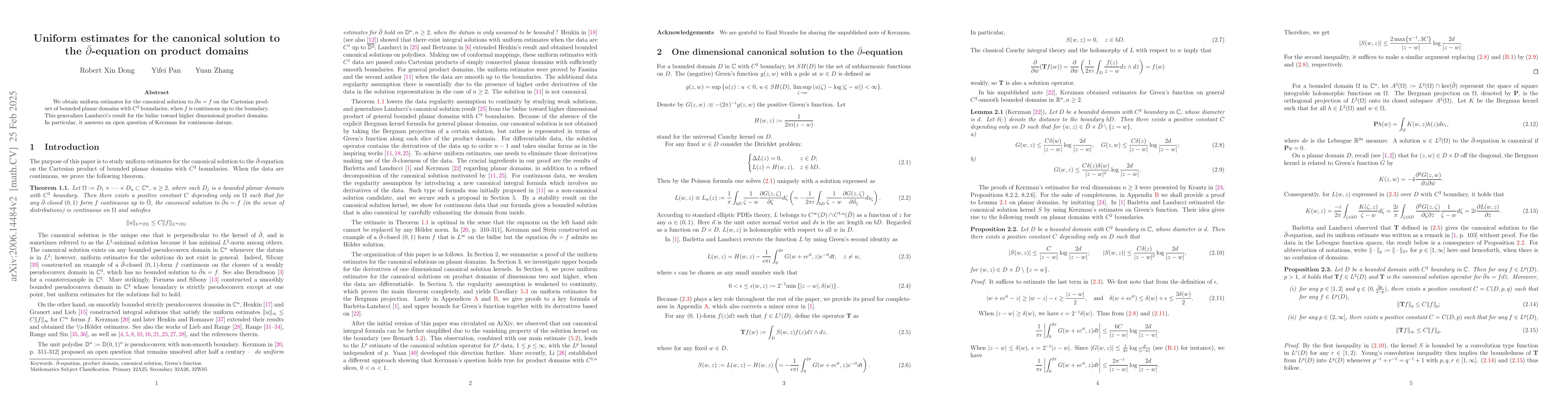 Summary: This paper provides uniform estimates for the canonical solution to the $\bar\partial$-equation on higher-dimensional product domains, extending Landucci's results from the bidisc to more general settings where $f$ is continuous up to the boundary.