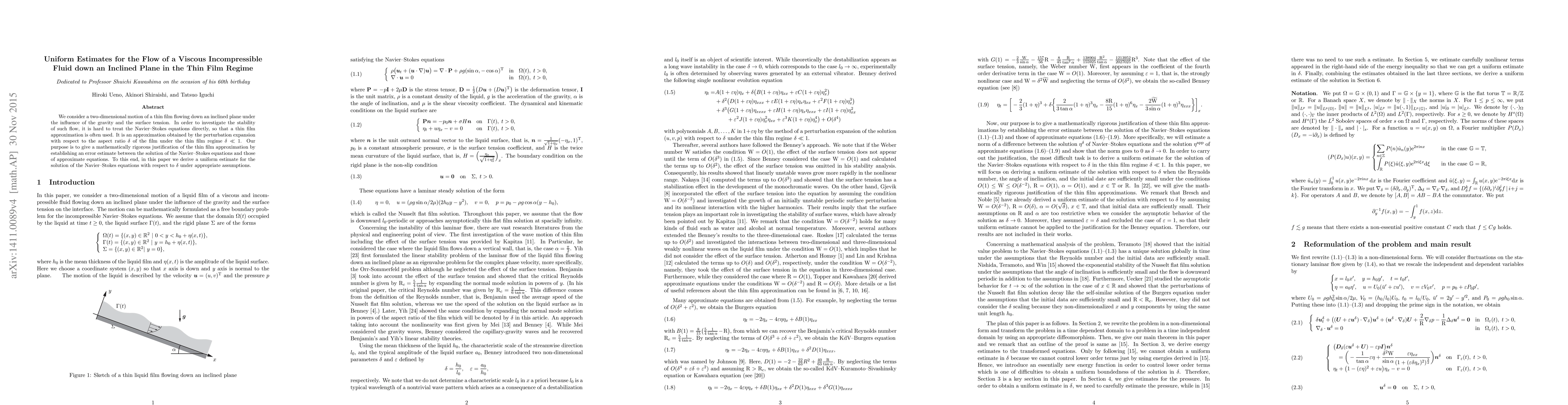 This paper provides a rigorous mathematical justification for the thin film approximation of the Navier-Stokes equations governing the flow of a viscous incompressible fluid down an inclined plane. It establishes uniform estimates to quantify the error between the exact solution and the approximate solution under the thin film regime.