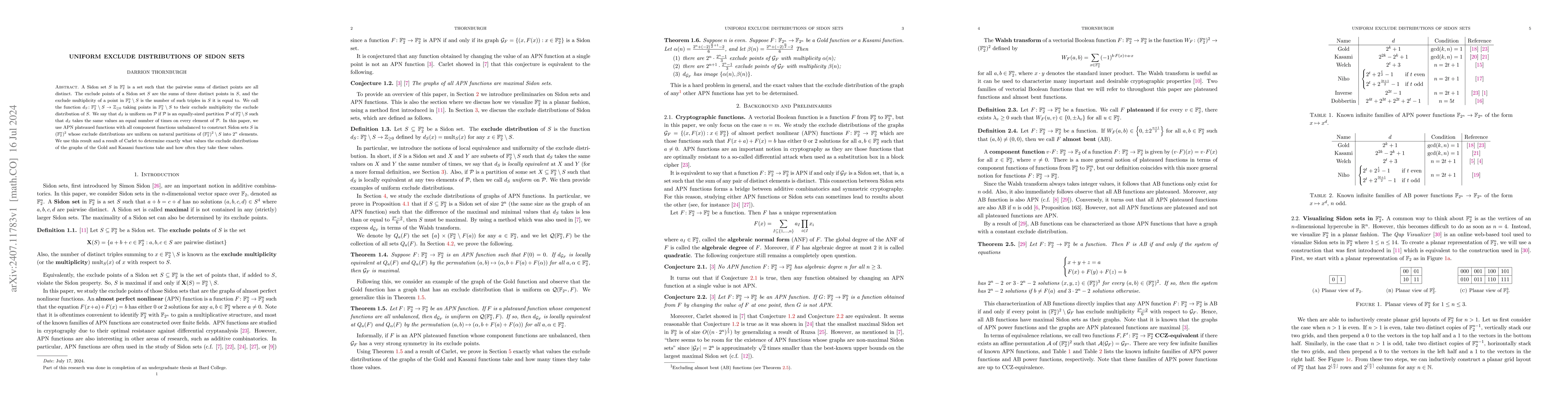 A Sidon set $S$ in $\mathbb{F}_2^n$ is a set such that the pairwise sums of distinct points are all distinct. The exclude points of a Sidon set $S$ are the sums of three distinct points in $S$, and the exclude multiplicity of a point in $\mathbb{F}_2^n \setminus S$ is the number of such triples in $S$ it is equal to. We call the function $d_S \colon \mathbb{F}_2^n \setminus S \to \mathbb{Z}_{\geq 0}$ taking points in $\mathbb{F}_2^n \setminus S$ to their exclude multiplicity the exclude distribution of $S$. We say that $d_S$ is uniform on $\mathcal{P}$ if $\mathcal{P}$ is an equally-sized partition $\mathcal{P}$ of $\mathbb{F}_2^n \setminus S$ such that $d_S$ takes the same values an equal number of times on every element of $\mathcal{P}$. In this paper, we use APN plateaued functions with all component functions unbalanced to construct Sidon sets $S$ in $(\mathbb{F}_2^n)^2$ whose exclude distributions are uniform on natural partitions of $(\mathbb{F}_2^n)^2 \setminus S$ into $2^n$ elements. We use this result and a result of Carlet to determine exactly what values the exclude distributions of the graphs of the Gold and Kasami functions take and how often they take these values.