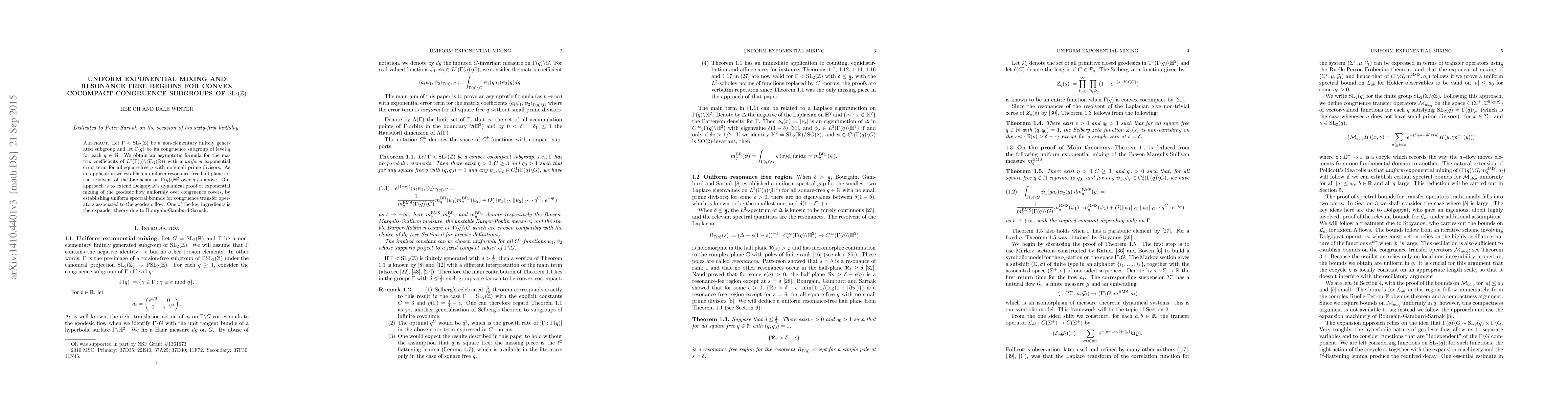 Let $\Gamma<\mathrm{SL}_2(\mathbb{Z})$ be a non-elementary finitely generated subgroup and let $\Gamma(q)$ be its congruence subgroup of level $q$ for each $q\in \mathbb{N}$. We obtain an asymptotic formula for the matrix coefficients of $L^2(\Gamma (q) \backslash \mathrm{SL}_2(\mathbb{R}))$ with a {\it uniform} exponential error term for all square-free $q$ with no small prime divisors. As an application we establish a uniform resonance-free half plane for the resolvent of the Laplacian on $\Gamma (q) \backslash \mathbb{H}^2$ over $q$ as above. Our approach is to extend Dolgopyat's dynamical proof of exponential mixing of the geodesic flow uniformly over congruence covers, by establishing uniform spectral bounds for congruence transfer operators associated to the geodesic flow. One of the key ingredients is the expander theory due to Bourgain-Gamburd-Sarnak.